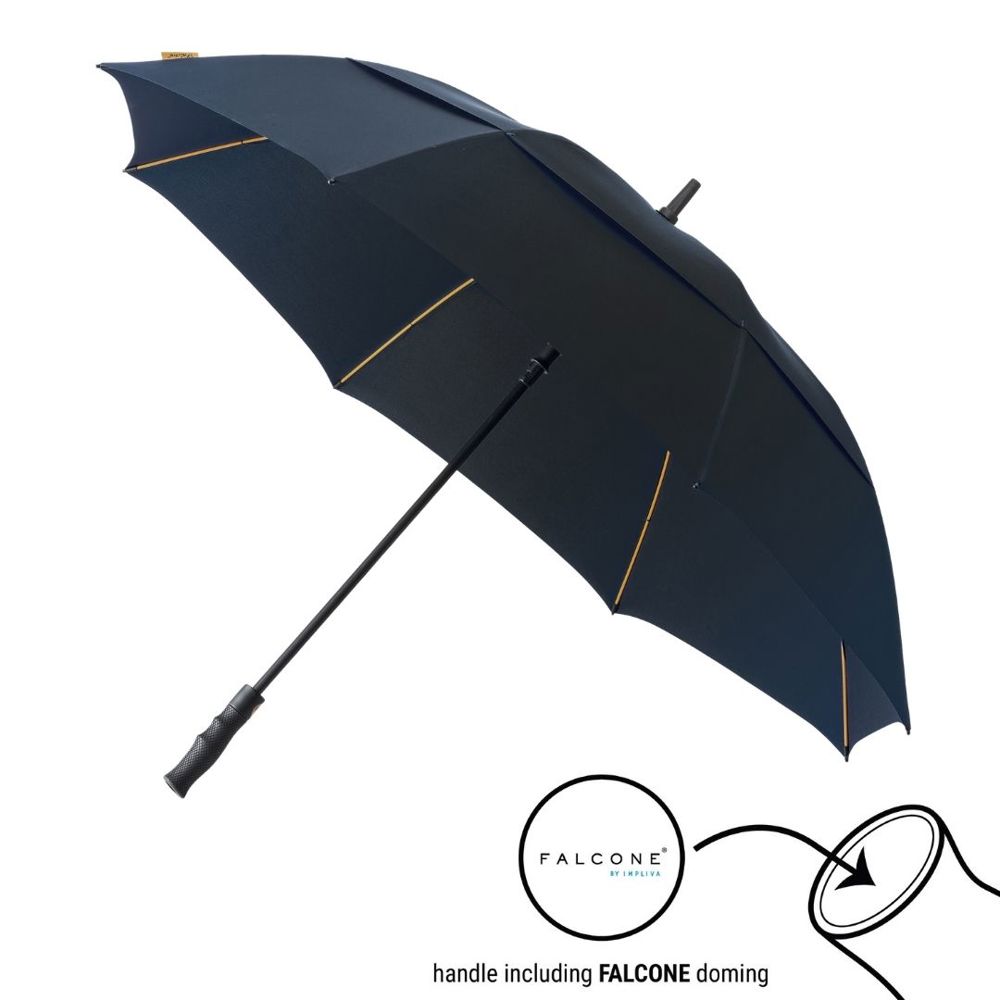 GP-76 FALCONE hoge kwaliteit windproof golfparaplu, automaat. Hoogwaardig oranje glasfiber frame. 210T polyester pongee doek met overlappende panelen om de wind door te laten. Zwart rubber finished handvat, met een opening aan de onderkant om uw eigen doming toe te voegen en met een foedraal.