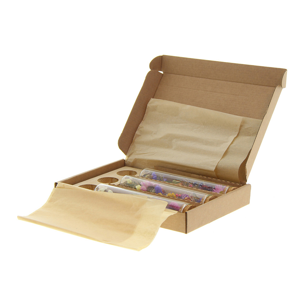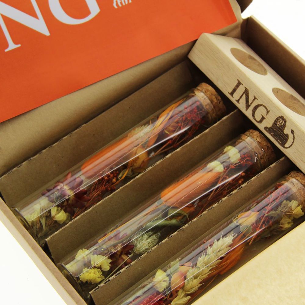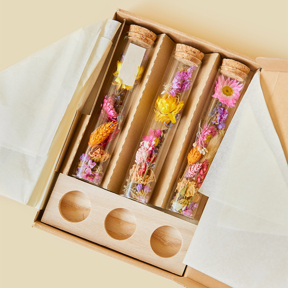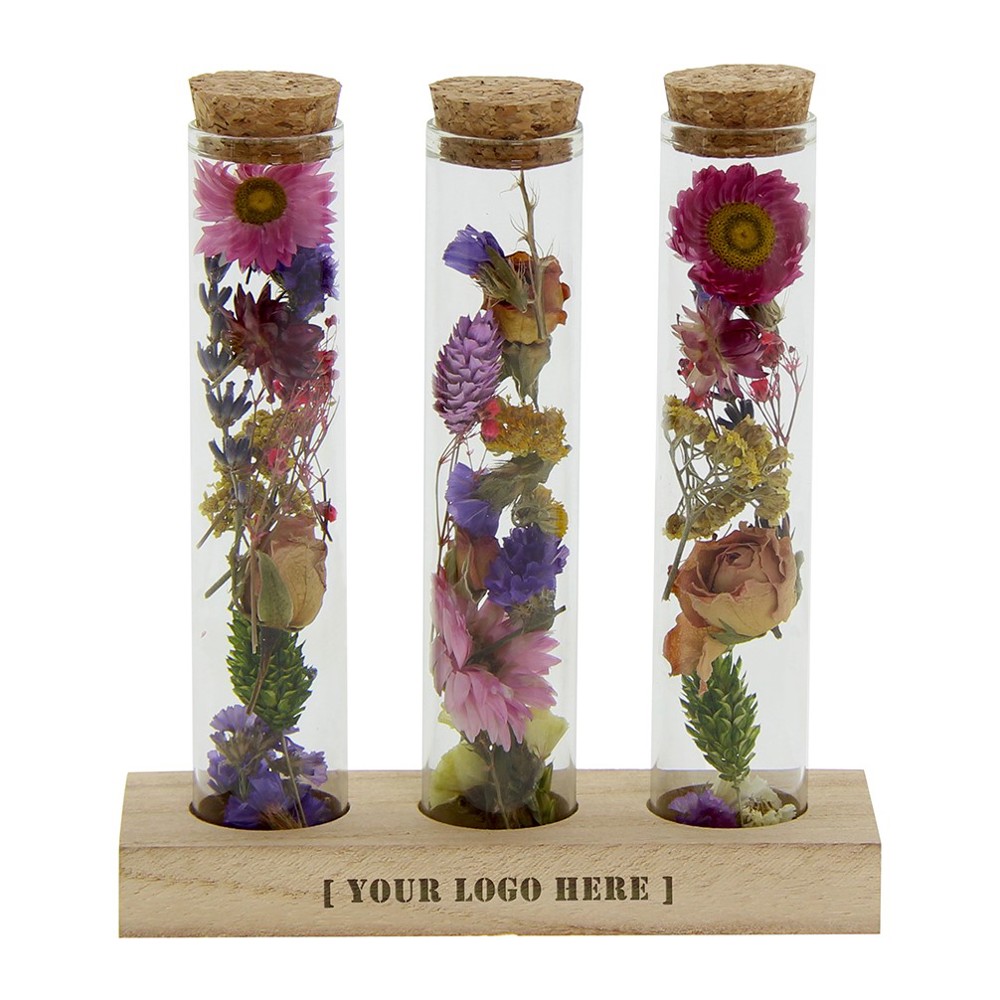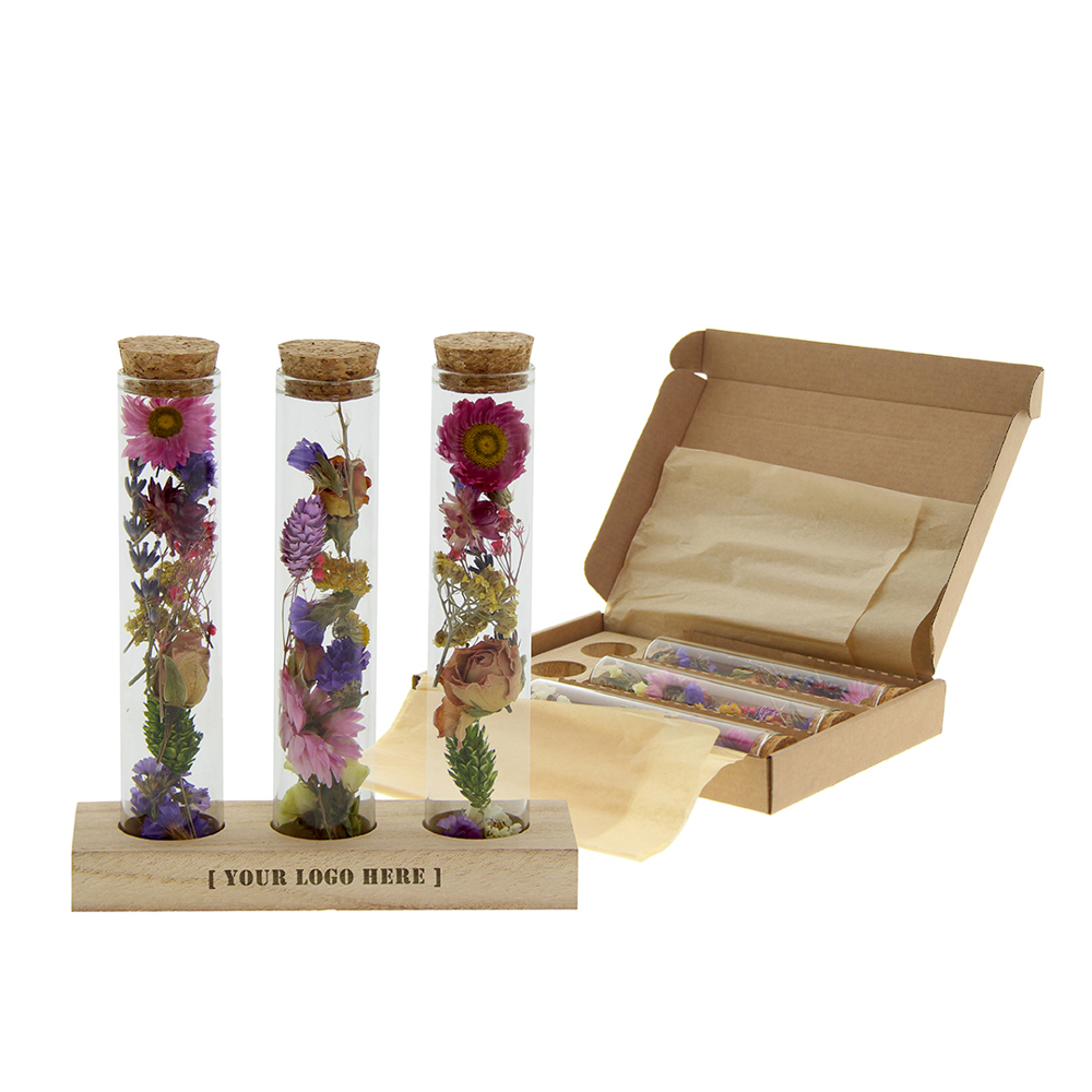 Deze luxe uitvoering bestaat uit drie glazen buisjes met zorgvuldig geselecteerde droogbloemen, gepresenteerd op een houten standaard. Zowel het hout als de kleuren van de bloemen kunnen worden afgestemd op jouw huisstijl. De standaard biedt ruimte voor personalisatie met een logo, slogan of andere boodschap.
