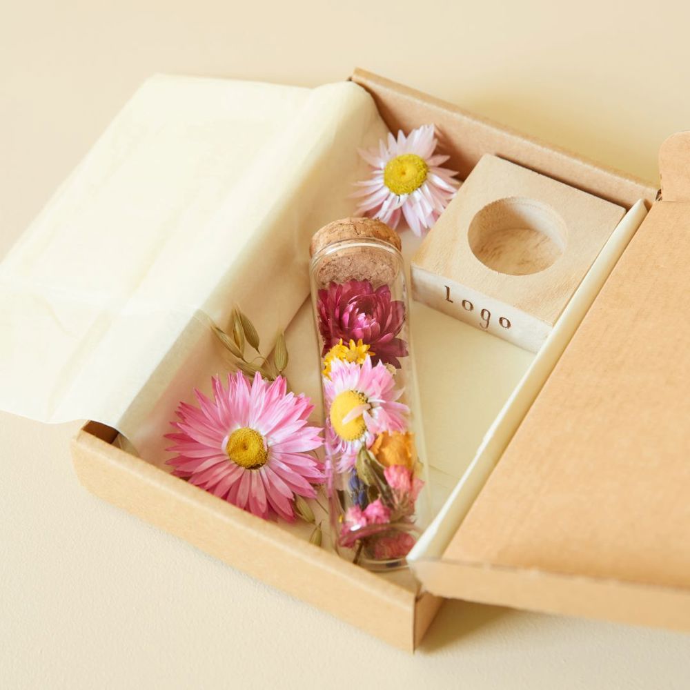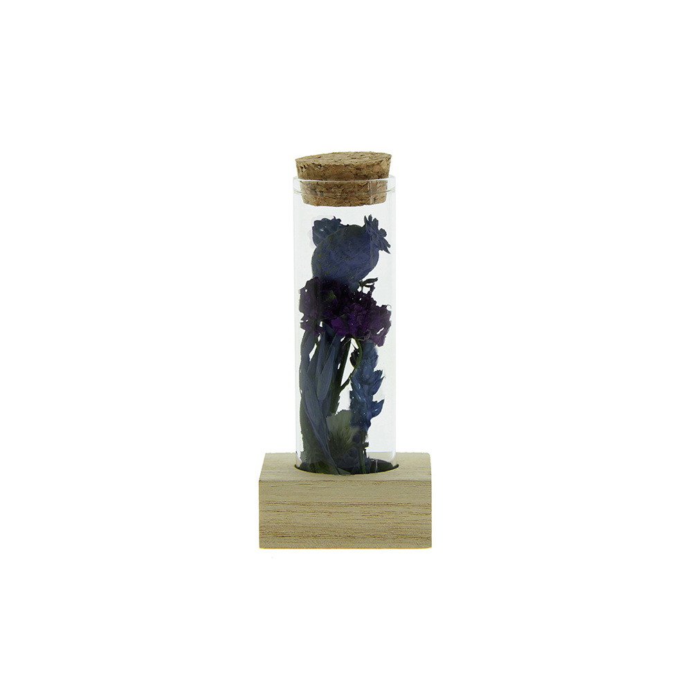 Een compact en elegant geschenk met impact: deze droogbloemvariant bestaat uit één glazen buisje gevuld met lang houdbare droogbloemen in kleuren die passen bij jouw huisstijl. Het buisje staat stevig op een houten standaard die gepersonaliseerd kan worden met een logo, bedrijfsnaam of korte boodschap.