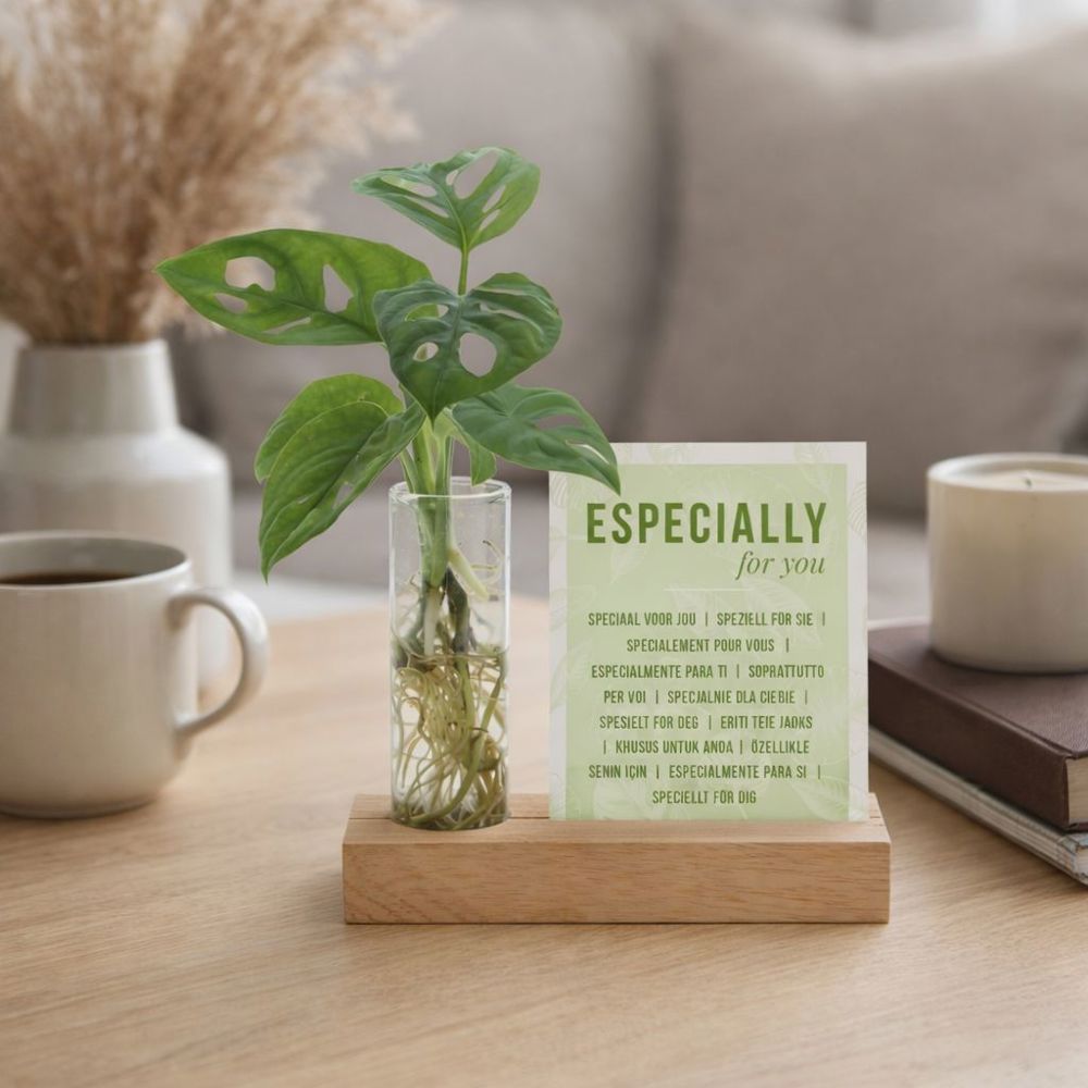 Deze stijlvolle hydroponieplant wordt gepresenteerd in een glazen buisje op een houten standaard met een sleuf voor een los A7-kaartje. Zowel het houten blokje als het kaartje zijn volledig te personaliseren met een logo, slogan of persoonlijke boodschap. Bij dit artikel is het A7-kaartje zoals op de foto standaard inbegrepen. Wil je in plaats daarvan een eigen gepersonaliseerd kaartje in full color toevoegen? Kies dan de personalisatie-optie, je betaalt alleen de opstartkosten voor het bedrukken.