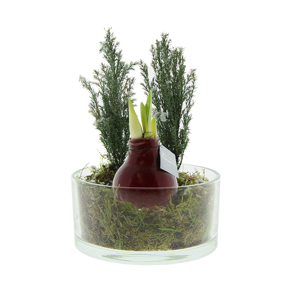No Water Flowers® zijn een luxe, groeiend en bloeiend geschenk. De levende No Water Flowers® staan bekend om de unieke handgemaakte wax amaryllisbollen. Deze speciaal geselecteerde en geteste amaryllisbollen hebben genoeg energie om zonder water te groeien en te bloeien. Authentieke No Water Flowers® geven vrij korte bloemstelen, vallen niet om en bloeien gegarandeerd. Iedere No Water Flowers® wordt zorgvuldig schoongemaakt en tot in perfectie gewaxt. Dit geeft de bloembol een eigentijdse en modieuze uitstraling. Dit luxe No Water Flowers® arrangement is samengesteld met 2 mini-kerstboompjes en een originele No Water Flowers. Gevuld met mos en aarde maakt het een uniek groen pakket. Dit arrangement behoort tot de meest luxueuze en tegelijk groenste kerstgeschenken die er zijn.