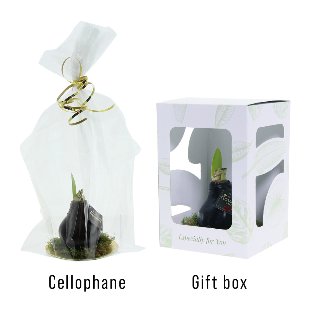 De Originele No Water Flowers® zijn makkelijk te herkennen aan het vierkante label die aan de bol bevestigd is. Deze amaryllisbollen hebben geen verzorging nodig. Zet de wax amaryllis op een lichte plek, maar niet in direct zonlicht en geniet van de prachtige bloemen die zich binnen 3 tot 5 weken ontwikkelen. Bloembollen zijn natuurproducten, elke bol is uniek op zichzelf en heeft een andere vorm.