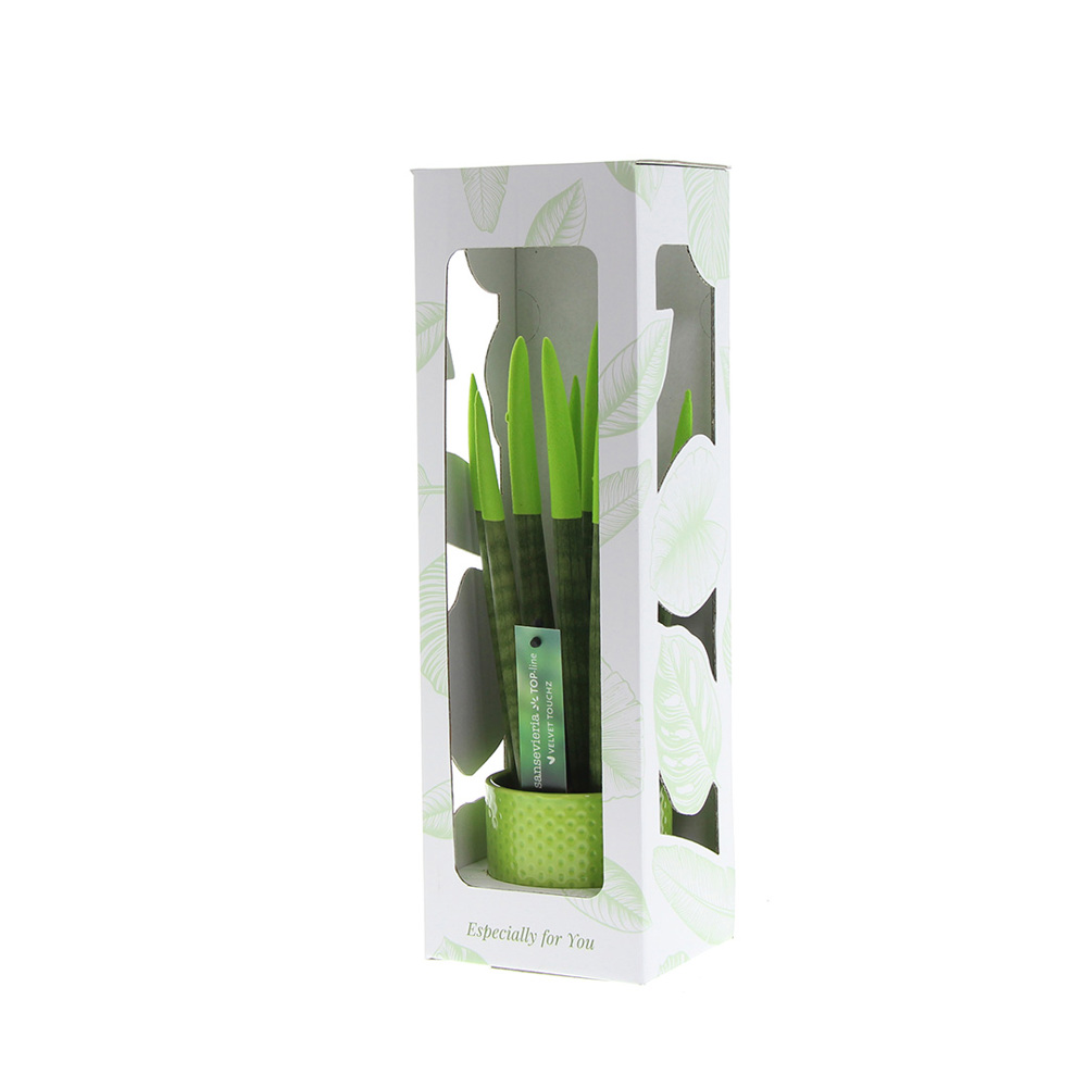 Onze TOP-line sansevieria's zijn bedekt met een zacht fluwelen materiaal, bekend als de Velvet Touchz variant, waardoor ze niet alleen visueel aantrekkelijk zijn, maar ook heerlijk aanvoelen. Met onze TOP-line serie kun je je eigen huisstijl van het bedrijf volledig tot uiting brengen. Of het nu de kleur van je logo gaat, of iets wat leuk is voor op de bureaus om door het hele kantoor terug te laten komen, de mogelijkheden zijn eindeloos. Dit plantje staat in een keramiek potje en kan verpakt worden in een FSC gecertificeerde giftbox wat het weggeven extra leuk maakt. Deze plant kan wel jaren meegaan en vergt weinig onderhoud.