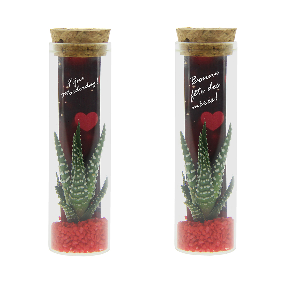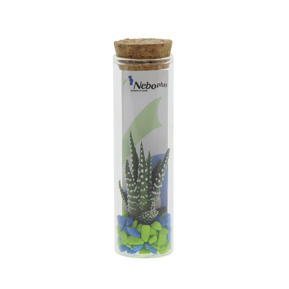 De Tiny Treasurez® Message in a bottle small is een originele groene give-away, perfect als relatiegeschenk tijdens evenementen, beurzen, themadagen of bedankmomenten. In het glazen flesje bevindt zich een laagje zand of gekleurd grind, een sfeerkaartje met informatie over de Tiny Treasurez en natuurlijk de levende mini-succulent. Het standaard kaartje kan desgewenst worden vervangen of gepersonaliseerd met een eigen boodschap. Ook de kurk op de fles kan bedrukt worden.