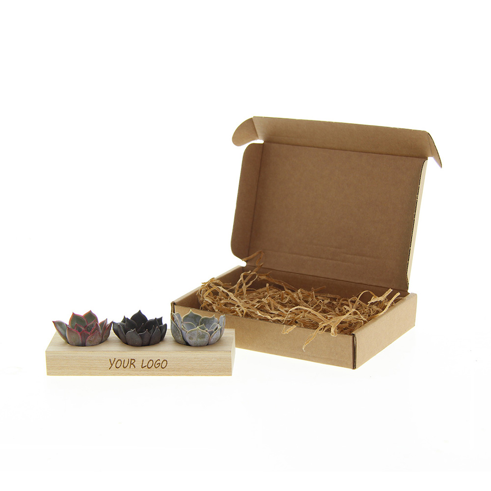 Het FSC-gecertificeerde houten standaardje dient als houder voor de 3 mini-succulenten. De houder kan worden gepersonaliseerd met jouw logo, slogan of boodschap. Het totaal is fraai verpakt in een doosje. Deze combinatie van hout en de Tiny Treasurez® is een perfect item voor op het bureau. Op het kaartje staat het verhaal achter de Tiny Treasurez®, zodat ook de ontvanger weet wat voor unieks hij of zij ontvangt. Het levende plantje blijft lang in beeld bij de ontvanger, omdat het niet zomaar in een kast of prullenbak verdwijnt. Personaliseer ze met een boodschap op het product of door middel van een kaartje voor een blijvende indruk. Breng wat extra groene decoratie in huis met onze Tiny Treasurez®.
