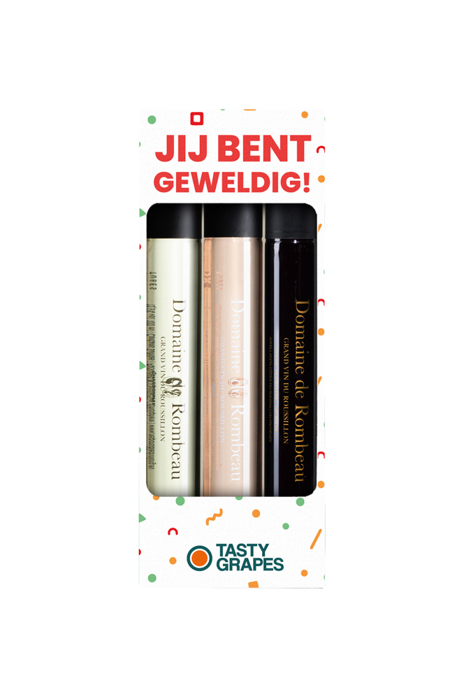 Glazen 100 ML tube gevuld met Rosé van Domaine de Rombeau (12,5% vol).