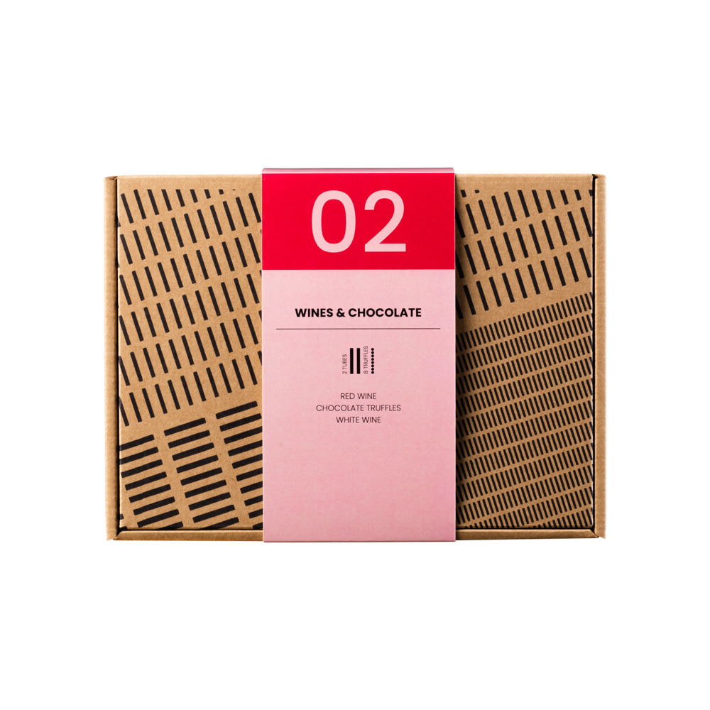 Wijnproeverij in een kraft giftbox met 2 glazen 100 ML tubes met wijnen van Domaine de Rombeau en chocoladetruffels. De proeverij bestaat uit een rode (14,5% vol) en een witte wijn (13,5% vol) en 8 chocoladetruffels.