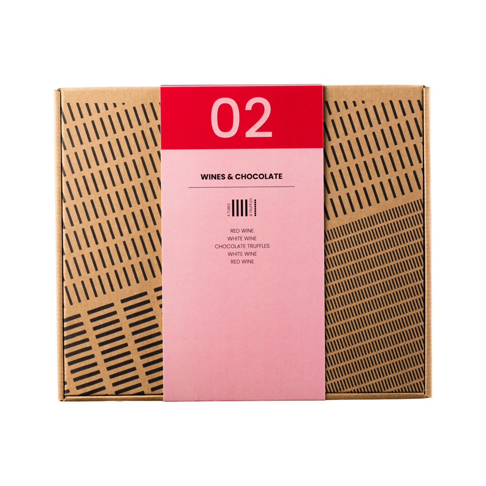 Wijnproeverij in een kraft giftbox met 4 glazen 100 ML tubes met wijnen van Domaine de Rombeau en chocoladetruffels. De proeverij bestaat uit 2 rode (14,5% vol) en 2 witte wijnen (13,5% vol) en 8 chocoladetruffels.