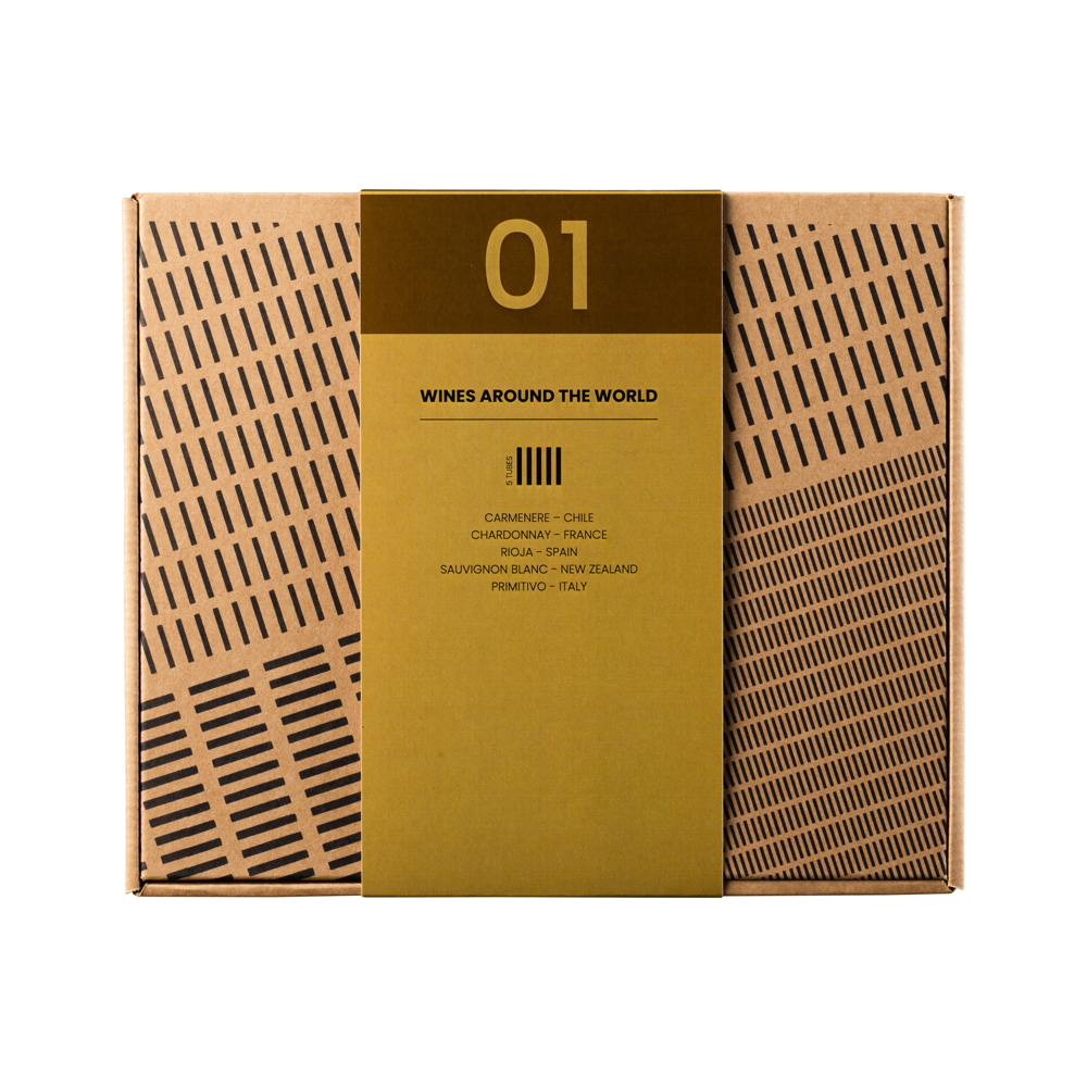 Wijnproeverij in een kraft giftbox bestaande uit 5 glazen 100 ML tubes met verschillende wijnen uit Frankrijk (14% vol), Chili (13,5% vol), Spanje (13% vol), Italië (14% vol) en Nieuw-Zeeland (12% vol).