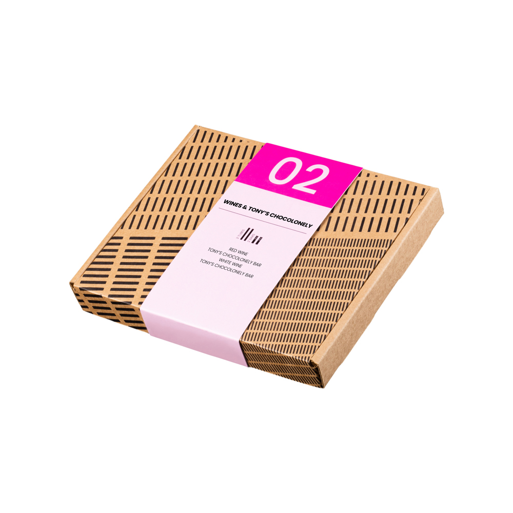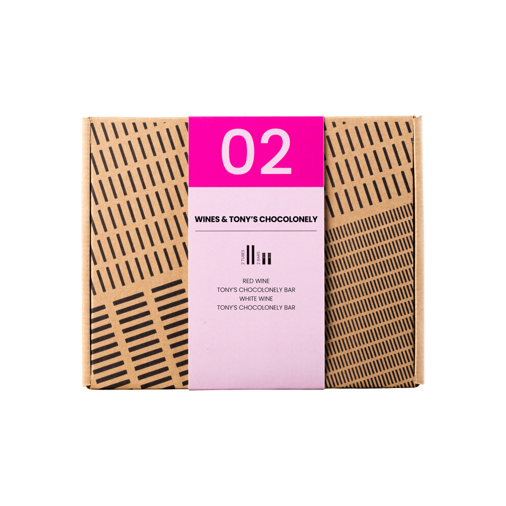 4- Delige mini wijnproeverij in een brievenbusgeschenkpakket met 2 rPET 100 ML tubes met wijnen van Domaine de Rombeau gecombineerd met 2 mini repen van Tony's Chocolonely. De proeverij bestaat uit een rode (14,5% vol) en een witte wijn (13,5% vol) en mini repen in de smaken puur en melk chocolade.