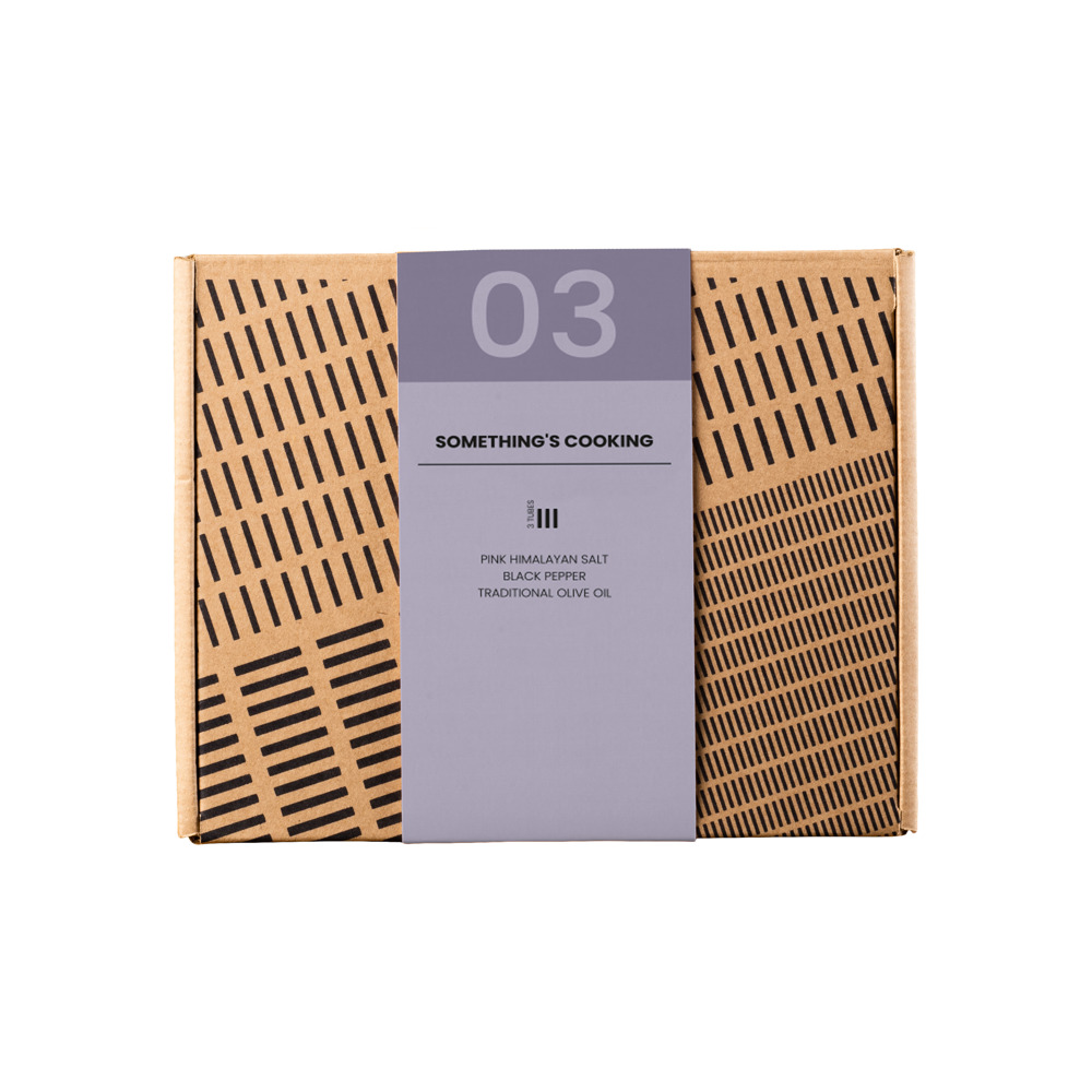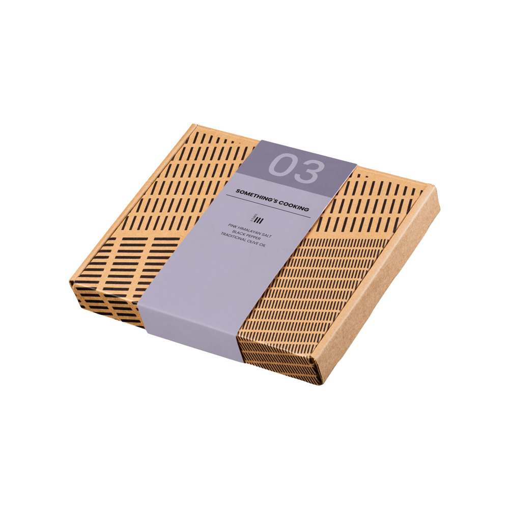 Mini 3-delige kookbox met 3 rPET tubes. Het brievenbusgeschenkpakket bestaat uit Himalaya zout, zwarte peper en traditionele olijfolie.