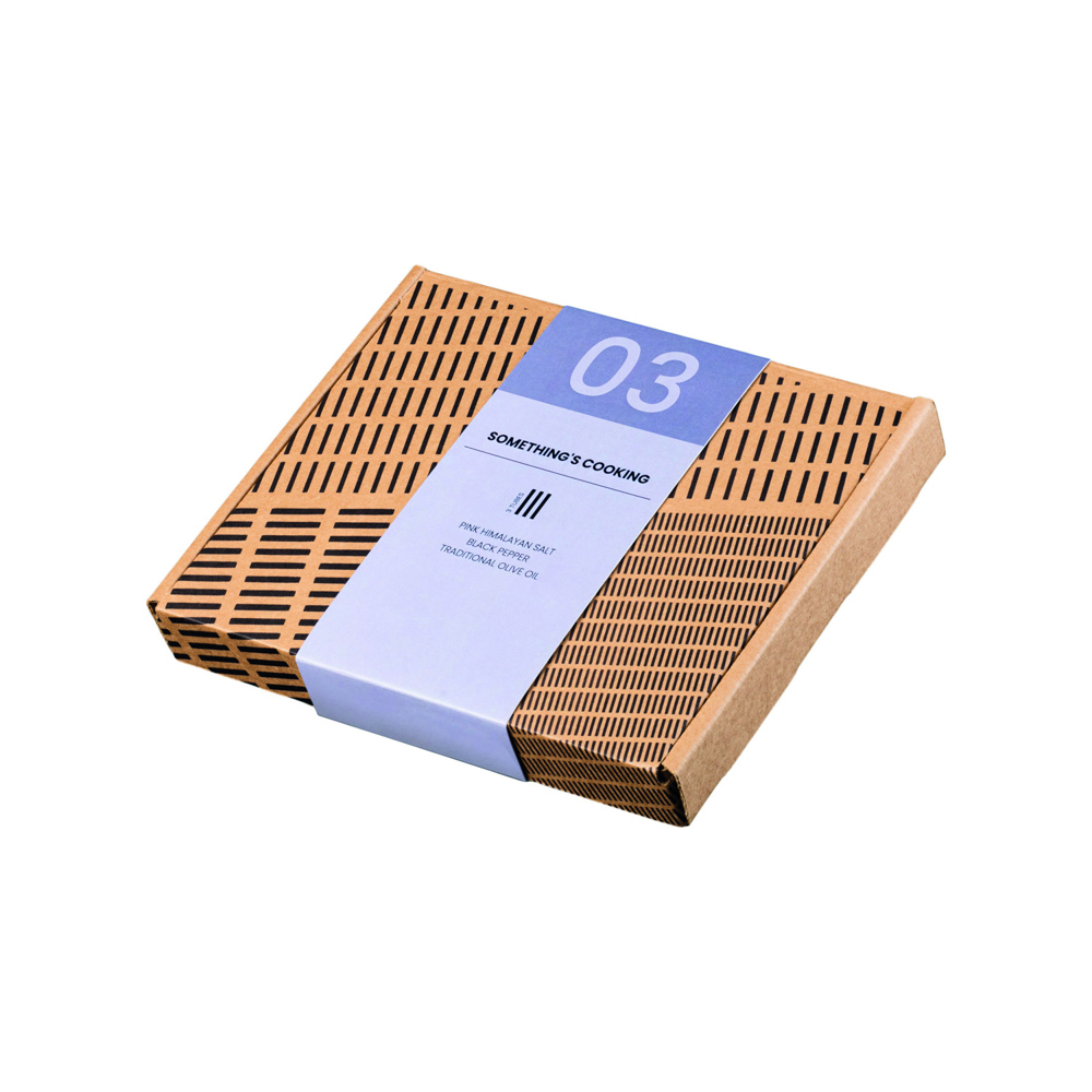 Mini 3-delige kookbox met 3 rPET tubes. Het brievenbusgeschenkpakket bestaat uit Himalaya zout, zwarte peper en traditionele olijfolie.
