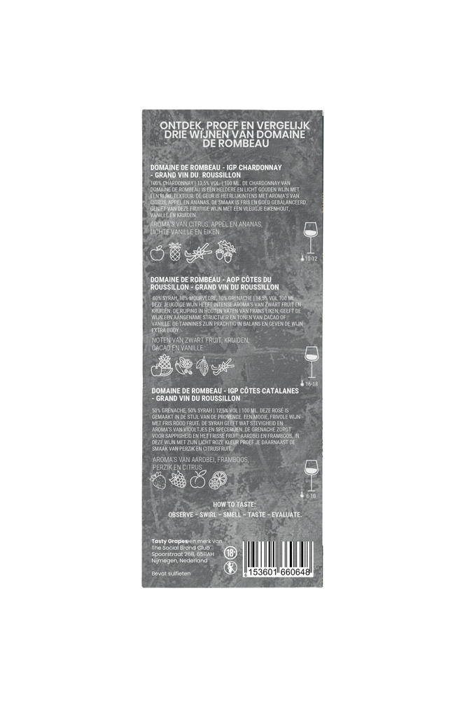Tasty Grapes Moments wijnproeverij in box inclusief quote ""Voor mannen met smaak!"" met 3 rPET 100 ML tubes met wijnen van Domaine de Rombeau. De proeverij bestaat uit een rosé (12,5% vol), rode (14,5% vol) en witte wijn (13,5% vol). Stoer, stijlvol en verrassend.