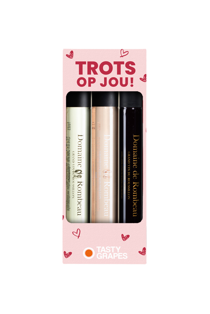 Tasty Grapes Moments wijnproeverij in box inclusief quote ""Merry x-mas!"" met 3 rPET 100 ML tubes met wijnen van Domaine de Rombeau. De proeverij bestaat uit een rosé (12,5% vol), rode (14,5% vol) en witte wijn (13,5% vol). Ideaal cadeau voor de feestdagen.