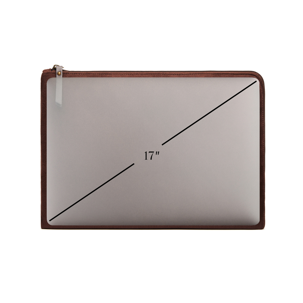 Een praktische, gevoerde laptoptas geschikt voor een 17-inch laptop. Deze veelzijdige tas is perfect om je laptop veilig en stijlvol overal mee naartoe te nemen. Het hoogwaardige ontwerp heeft een goede pasvorm voor eenvoudig gebruik, glad PU-materiaal en subtiele metalen details met een koperen afwerking. Het slanke en gestroomlijnde ontwerp past gemakkelijk in je tas of koffer. Zakenreizen waren nog nooit zo elegant!Geschikt voor laptops met een grootte van in totaal 17 inch. Denk eraan dat de afmetingen van het scherm niet hetzelfde zijn als die van de gehele laptop.