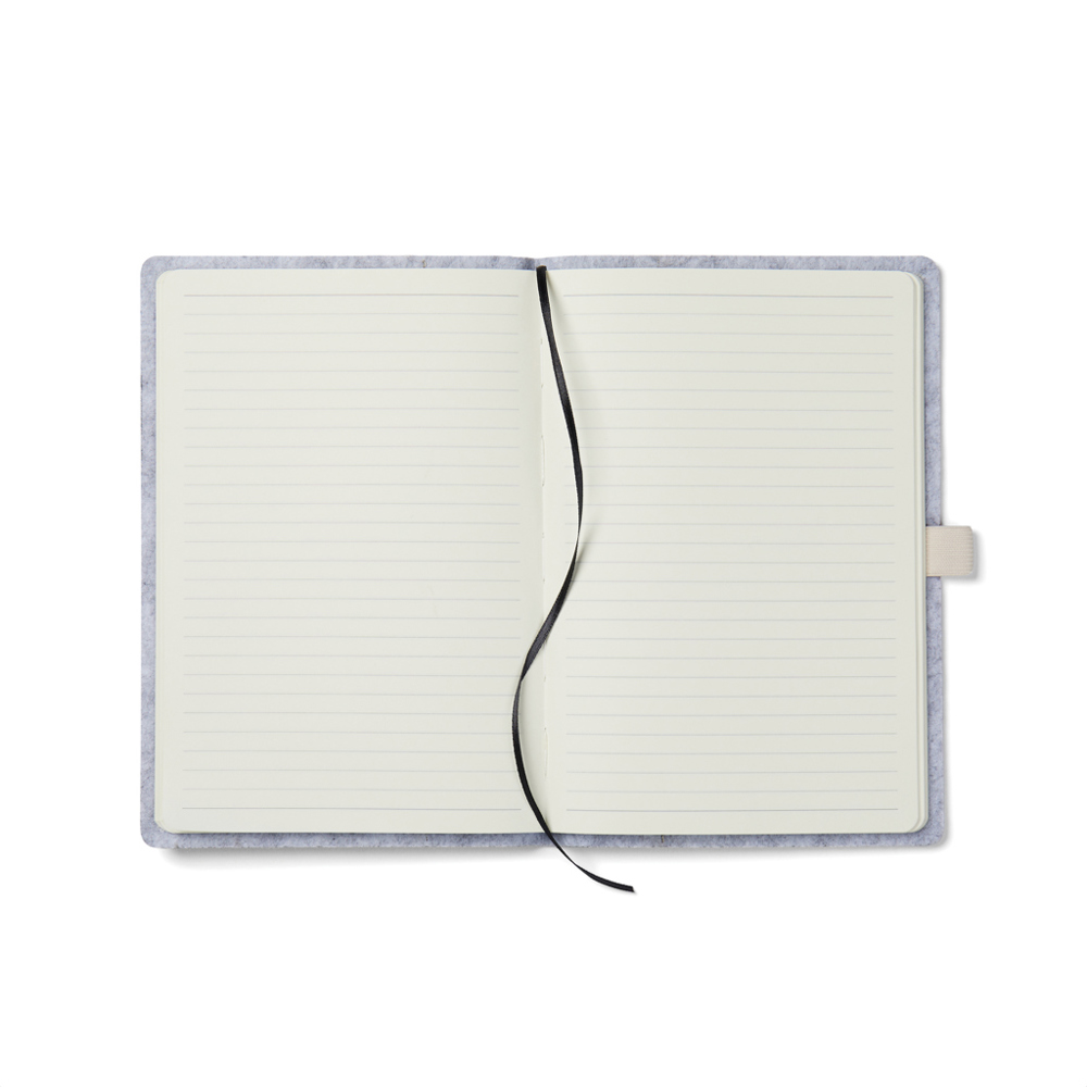 A5 notitieboek, elegant gemaakt van GRS gerecycled vilt, met een gemêleerd effect en een geïntegreerde penhouder. 80 vellen/160 pagina's gerecycled gelinieerd papier van 70 g/m² ideaal om aantekeningen in te maken. De GRS-certificering (Global Recycled Standard) garandeert dat de hele toeleveringsketen van de gerecyclede materialen gecertificeerd is. Het totale gerecyclede gehalte is gebaseerd op het totale productgewicht. Dit product bevat 83% GRS-gecertificeerd gerecycled papier en 7% GRS-gecertificeerd gerecycled vilt.