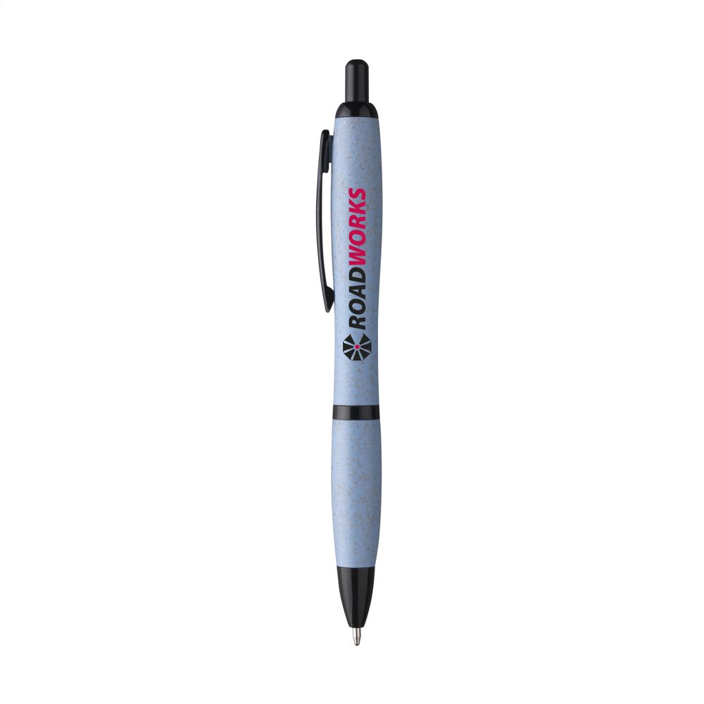 Blauwschrijvende balpen gemaakt van 50% PP en 50% tarwestro. Voorzien van zwarte accenten en metalen clip. Gedeeltelijk biologisch afbreekbaar.