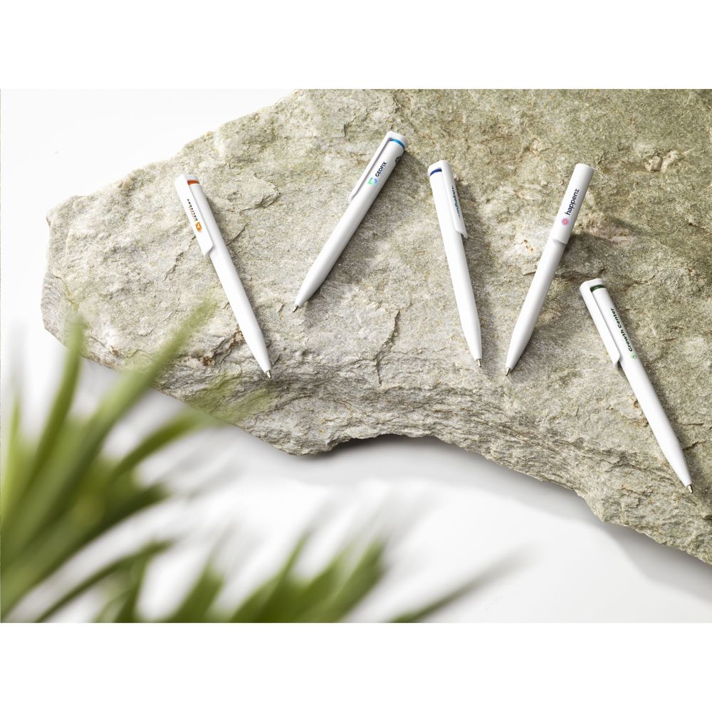 Blauwschrijvende balpen met houder gemaakt van 100% gerecycled ABS. De clip/drukknop heeft een opvallend kleuraccent en biedt ruimte voor een royale digitale full colour opdruk. GRS-gecertificeerd.