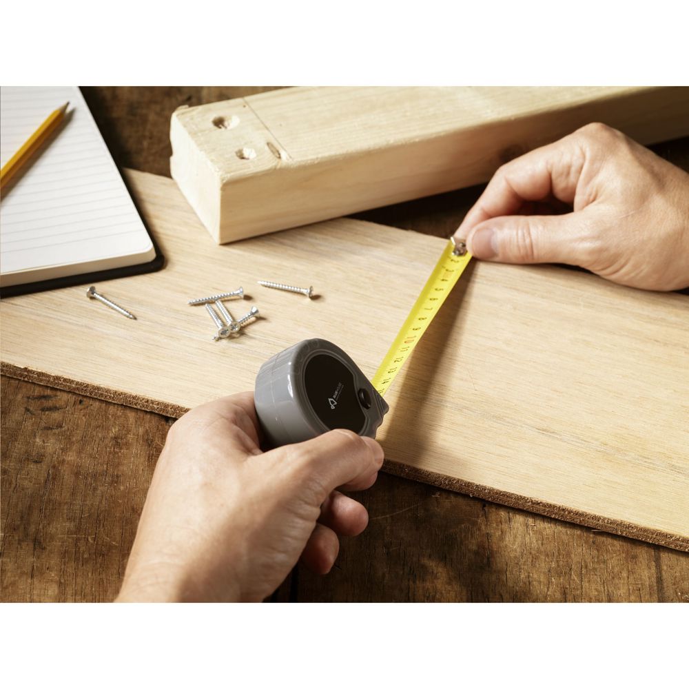Rolmaat met een behuizing van gerecycled ABS plastic en een hardstalen band met een lengte van 3 meter en een bandbreedte van 1,6 cm. Met aanduiding in centimeters, broekriemclip en polyester polsriem. Geijkt volgens Europese normen. RCS-gecertificeerd. Totaal gerecycled materiaal: 20%. Per stuk verpakt.