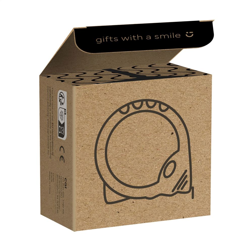 Polmaat met een behuizing van gerecycled ABS plastic en een hardstalen band met een lengte van 5 meter en een bandbreedte van 1,9 cm. Met aanduiding in centimeters, broekriemclip en polyester polsriem. Geijkt volgens Europese normen. RCS-gecertificeerd. Totaal gerecycled materiaal: 14%. Per stuk in kraft doos.