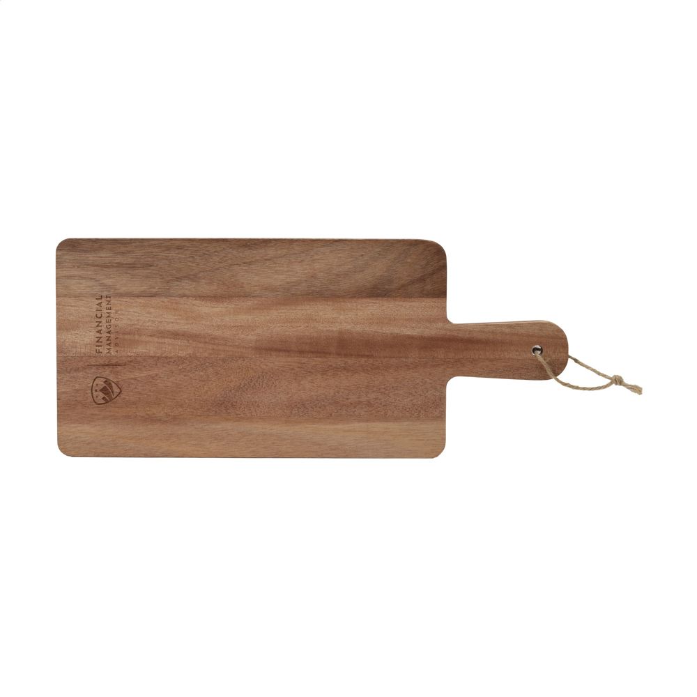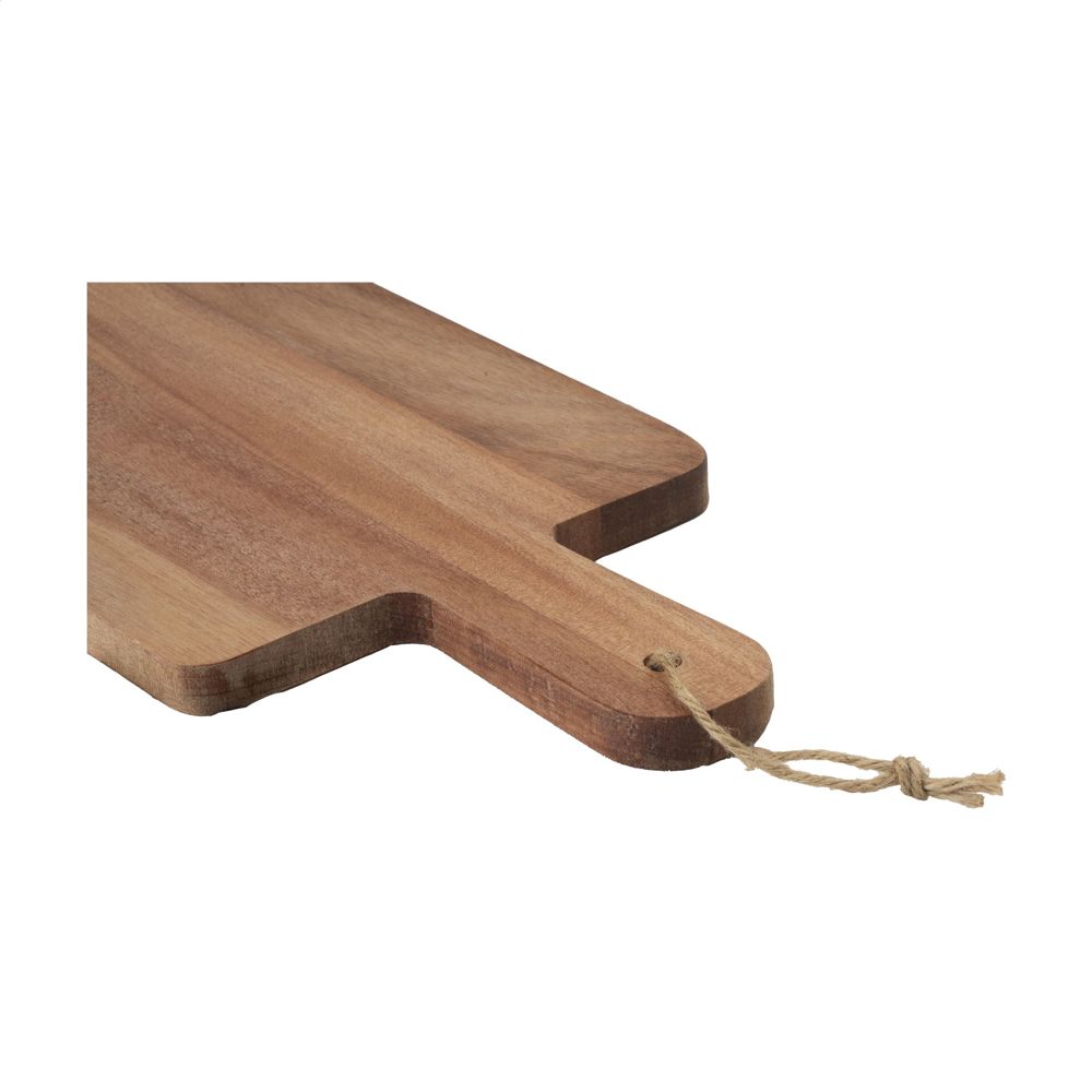 Prachtige, royale Wooosh serveerplank van FSC 100% gecertificeerd acaciahout, een robuuste houtsoort met een warme uitstraling. De fraaie kenmerken van acaciahout, zoals de fijne nerf, vlamtekeningen en wisselende kleurschakeringen, geven deze plank een uniek karakter. Deze plank is met zorg behandeld met een vegetarische sojabonenolie. Dankzij de bacteriedodende eigenschappen van acacia is deze plank van nature hygiënisch. De serveerplank is niet alleen functioneel, maar ook een decoratief pronkstuk. Het touwtje is praktisch en geeft extra karakter. De plank is groots in formaat en perfect voor het stijlvol presenteren van borrelhapjes of een smakelijke lunch. Laat deze prachtige plank een onmisbaar onderdeel worden van jouw culinaire beleving. Per stuk in een luxe Wooosh geschenkverpakking.