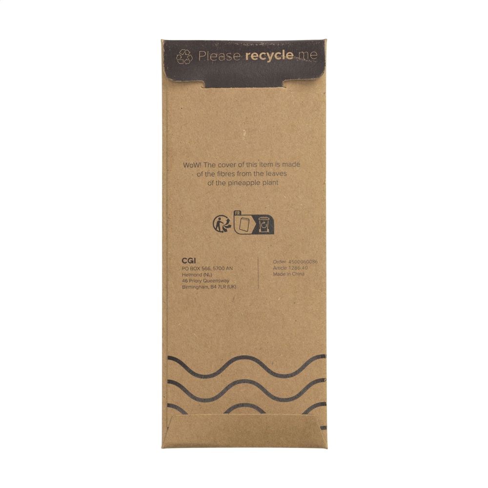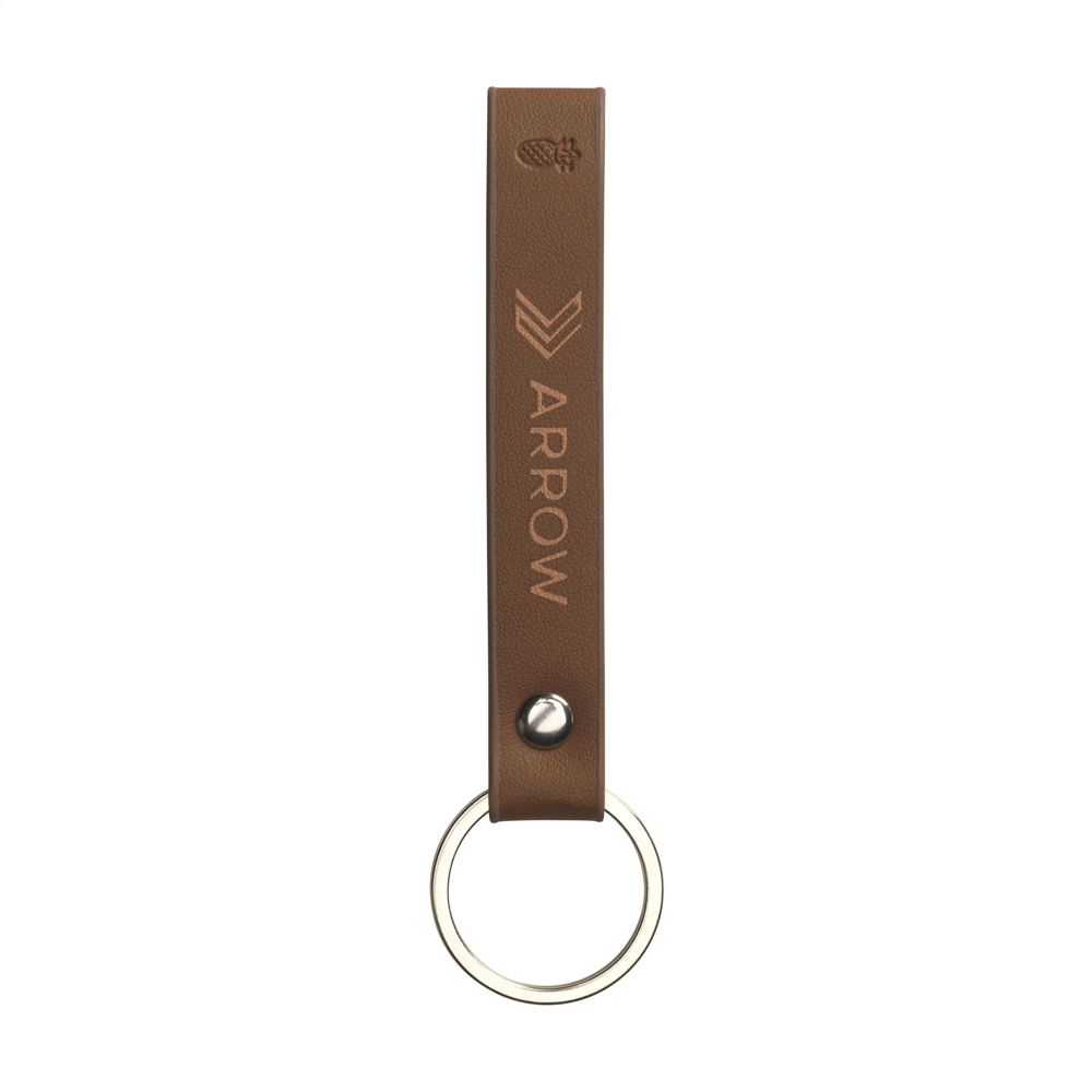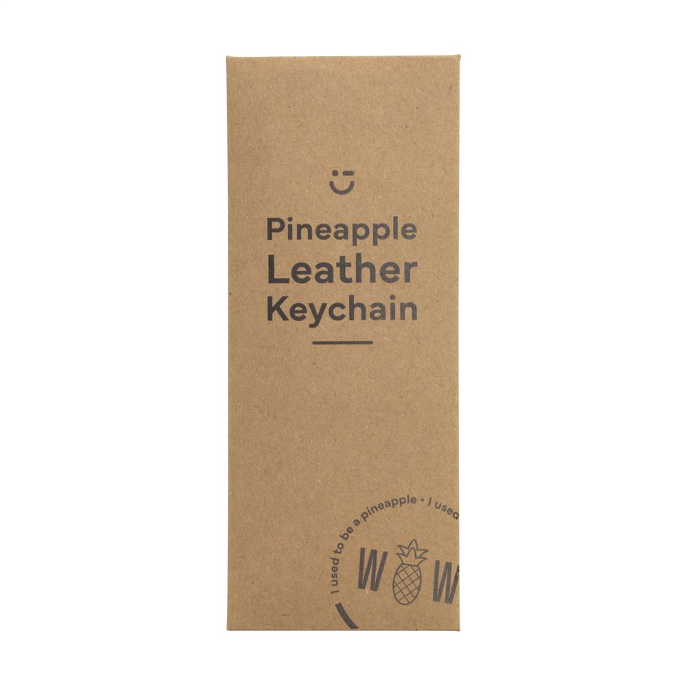 Sleutelhanger gemaakt van ananas-vegan-imitatieleer. Bevestigd aan een stevige, metalen sleutelring. Het vegan imitatieleer is vrijwel niet van echt leer te onderscheiden. Het materiaal is echter vervaardigd uit ananasbladeren, een restproduct van de ananasteelt. Om die reden zijn er ook geen extra stoffen nodig, zoals water, mest of pesticiden voor de productie ervan. De vezels van het ananasblad worden gewassenen, verrijkt met PU en gedroogd in de oven. Het resultaat? Soepele vellen veganistisch imitatieleer, die vervolgens worden voorzien van een prachtige afwerking. Na het drogen ontstaat een zacht en aantrekkelijk materiaal met de eigenschappen van leer. Het bestaat deels uit fruitresten en deels uit PU.
