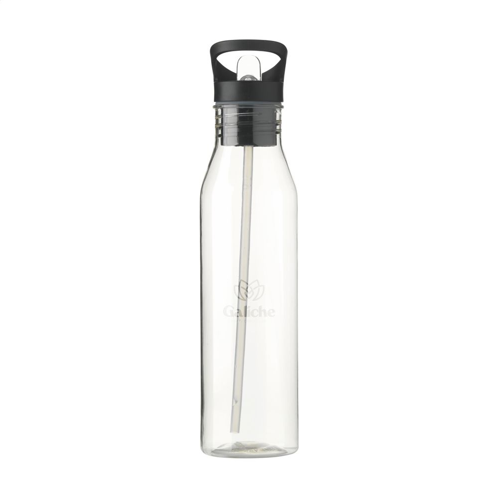 aterfles met transparante body van RPET. De schroefdop is voorzien van een inklapbaar mondstukje en afsluitbaar rietje. Tijdens het drinken kun je je hoofd recht houden. Zo houd je tijdens het autorijden je blik op de weg als je drinkt. De fles is gemakkelijk aan één vinger mee te nemen. Herbruikbaar en lekvrij. Niet vaatwasserbestendig. GRS-gecertificeerd. Totaal gerecycled materiaal: 69%. Inhoud 720 ml.