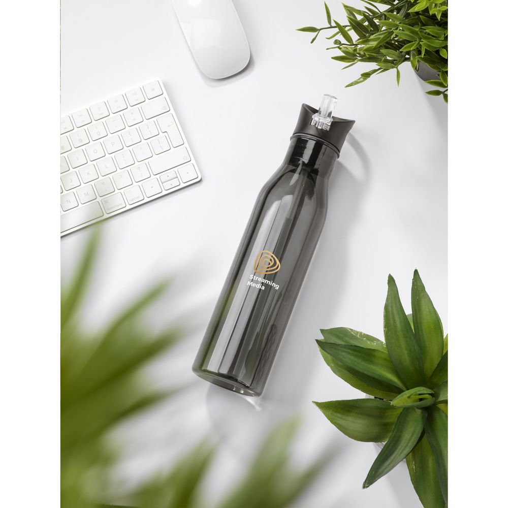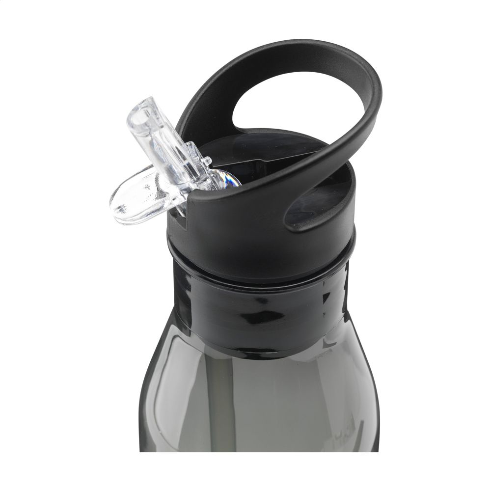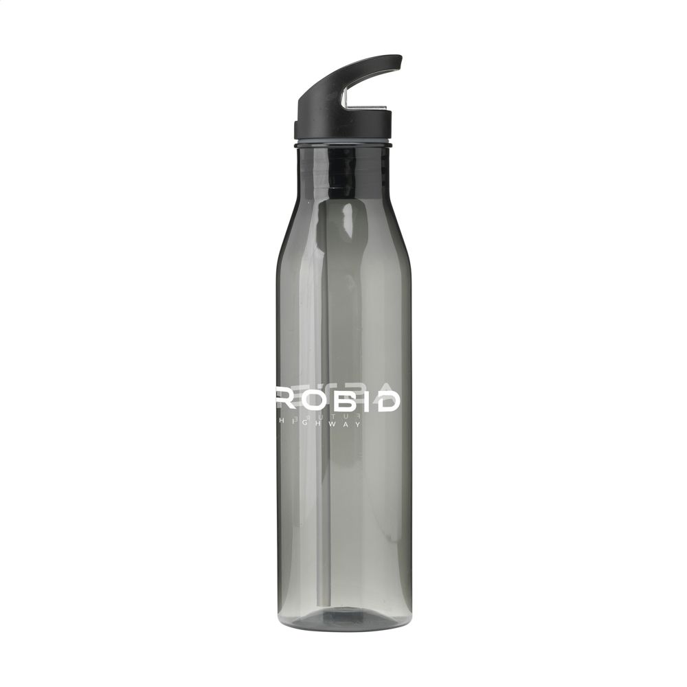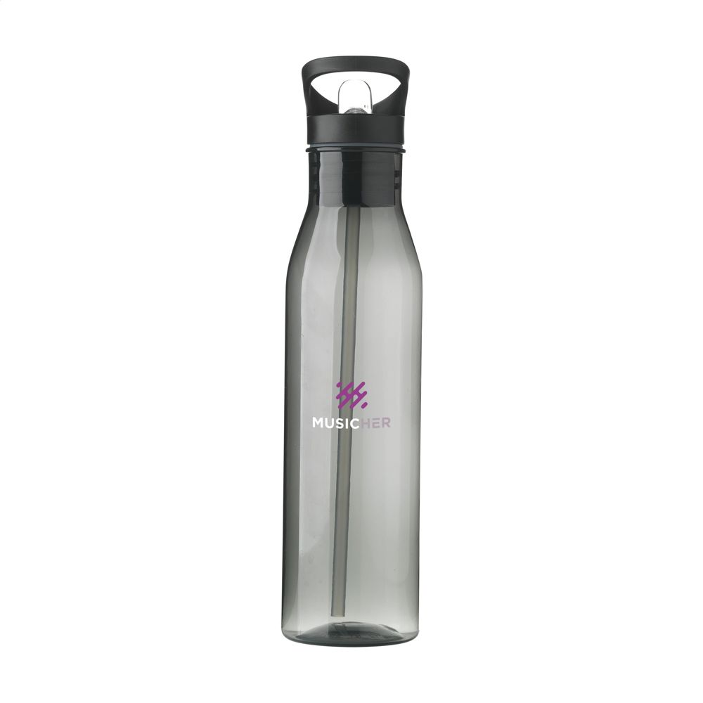 aterfles met transparante body van RPET. De schroefdop is voorzien van een inklapbaar mondstukje en afsluitbaar rietje. Tijdens het drinken kun je je hoofd recht houden. Zo houd je tijdens het autorijden je blik op de weg als je drinkt. De fles is gemakkelijk aan één vinger mee te nemen. Herbruikbaar en lekvrij. Niet vaatwasserbestendig. GRS-gecertificeerd. Totaal gerecycled materiaal: 69%. Inhoud 720 ml.