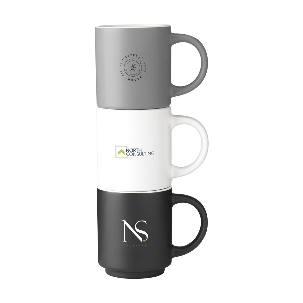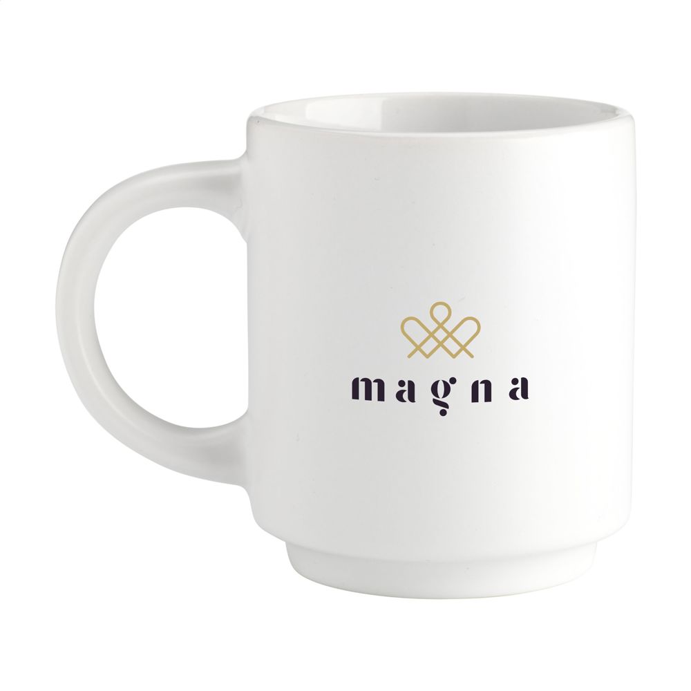 Stapelbare, ruimtebesparende automatenmok van hoogwaardig keramiek en 5% gerecycled keramiek. De mok heeft een opvallend groot oor voor een comfortabele grip. De buitenzijde van de mok heeft een chique matte finish, de binnenzijde is afgewerkt in hoogglans. Geschikt voor koffieapparaten. Vaatwasserbestendig. Inhoud 180 ml. OPMERKING: De witte mok kan niet worden voorzien van een lasergravure omdat deze onvoldoende zichtbaar is. Gerecyclede keramische mokken worden vervaardigd door grondstoffen te mengen met fragmenten van kapotte of onbruikbare mokken die in dezelfde fabriek zijn verzameld. Deze afgedankte componenten worden fijngemalen tot poeder en vervolgens gemengd met essentiële stoffen zoals kaolien en kwarts voordat ze worden omgezet in nieuwe keramische producten. Het uiteindelijke product bestaat doorgaans uit 5% tot 10% gerecycled keramiek om een optimale kwaliteit te garanderen. Het gebruik van gerecycled keramiek bevordert de circulaire economie en vermindert de behoefte aan nieuwe grondstoffen.