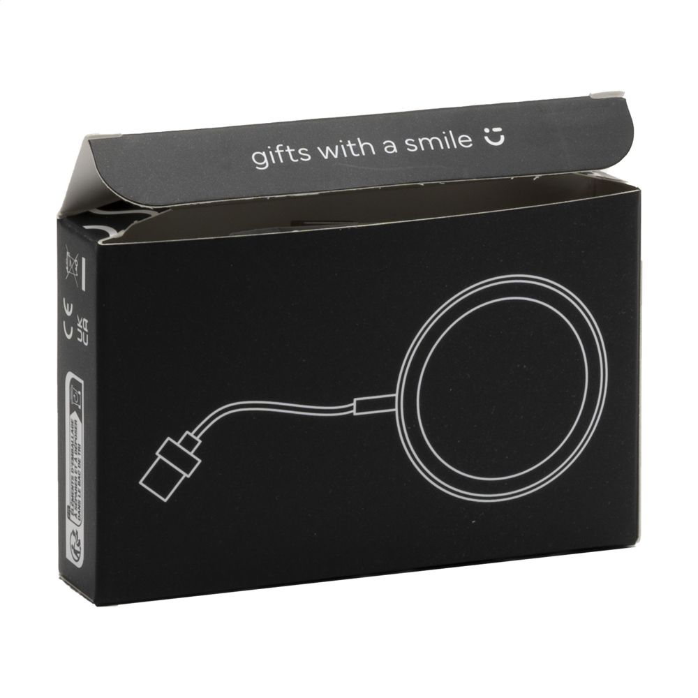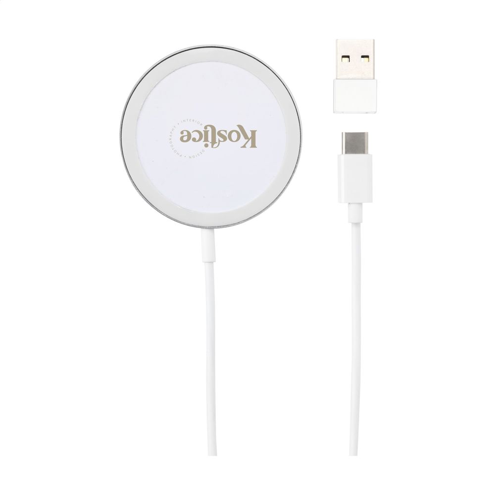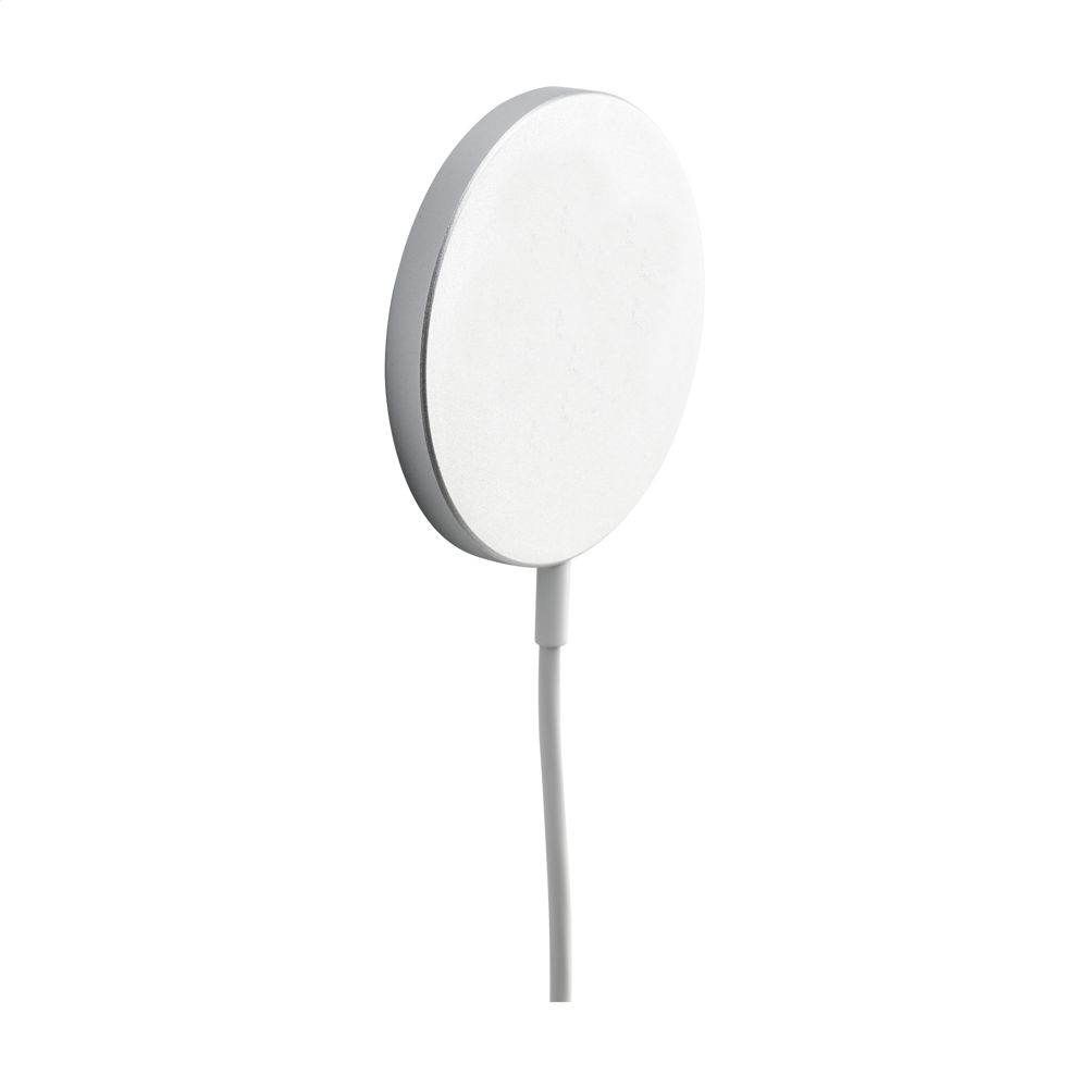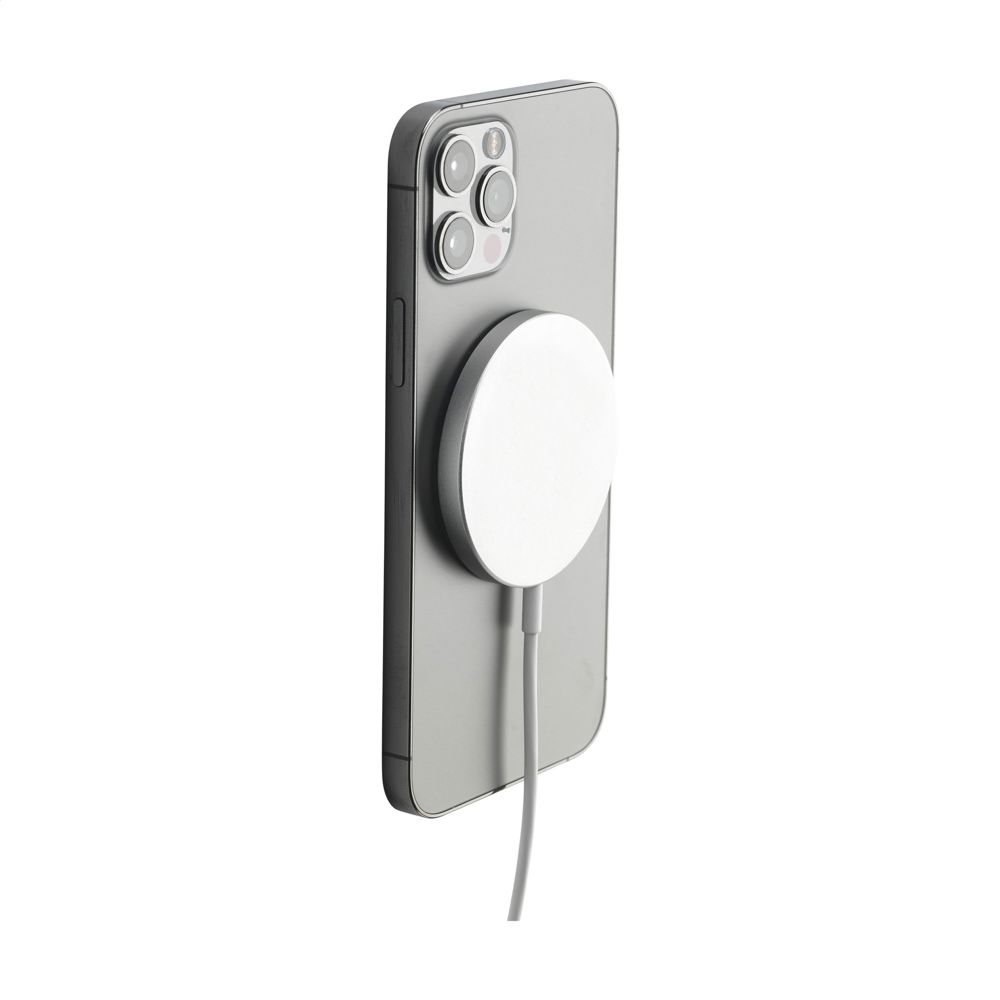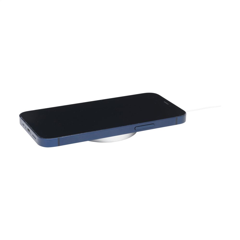 Magnetische 10W oplader met behuizing gemaakt van gerecycled ABS. Laad je smartphone draadloos op met deze oplader. Omdat er een magneet in zit, blijft je telefoon ermee verbonden, zelfs als je de telefoon gebruikt. Ideaal wanneer je jouw mobiele apparaat wilt opladen, maar ook wilt bellen of een video wilt bekijken. De geïntegreerde magneten (11 stuks hoge kwaliteit N52H en hittebestendig) in de oplader zijn perfect uitgelijnd en zorgen altijd voor de juiste oplaadpositie op de telefoon. Deze lader komt met een extra magnetische metalen ring om het opladen van niet-magnetische draadloze oplaadbare smartphones te ondersteunen. Compatibel met iPhone 12 en hoger. Output: DC 9V/1.1A (15W) voor snelladen. Inclusief oplaadkabel USB-C naar USB-C en gebruiksaanwijzing. Het product en de accessoires zijn PVC-vrij. RCS-gecertificeerd. Totaal gerecycled materiaal: 30%. Per stuk in kraft doos.