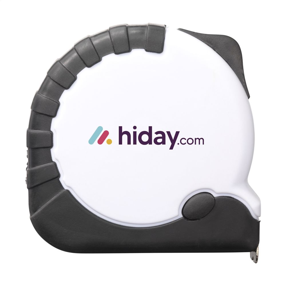 Rolmaat van gerecycled ABS plastic. Met hardstalen band (bandbreedte 19 mm), aanduiding in centimeters en inches, gripvast rubberen huis, ingebouwde, broekriemclip en polsriem. Per stuk verpakt.