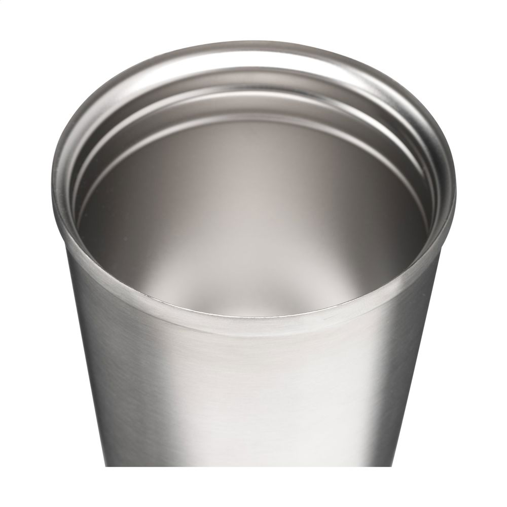 Dubbelwandige thermosbeker van gerecycled RVS. Mooi afgewerkt met een matte finish. Met PP schroefdeksel, klikopening en slipvaste onderzijde. Niet vaatwasserbestendig. RCS-gecertificeerd. Totaal gerecycled materiaal: 77%. Inhoud 450 ml gemeten tot aan de rand, zonder deksel. Inhoud gemeten met deksel ca. 300 ml. RVS kan vele malen gerecycled worden terwijl de kwaliteit van het materiaal grotendeels behouden blijft. Door het gebruik van gerecycled RVS worden minder nieuwe grondstoffen gebruikt. Dit betekent minder energieverbruik en minder gebruik van water. Per stuk verpakt.