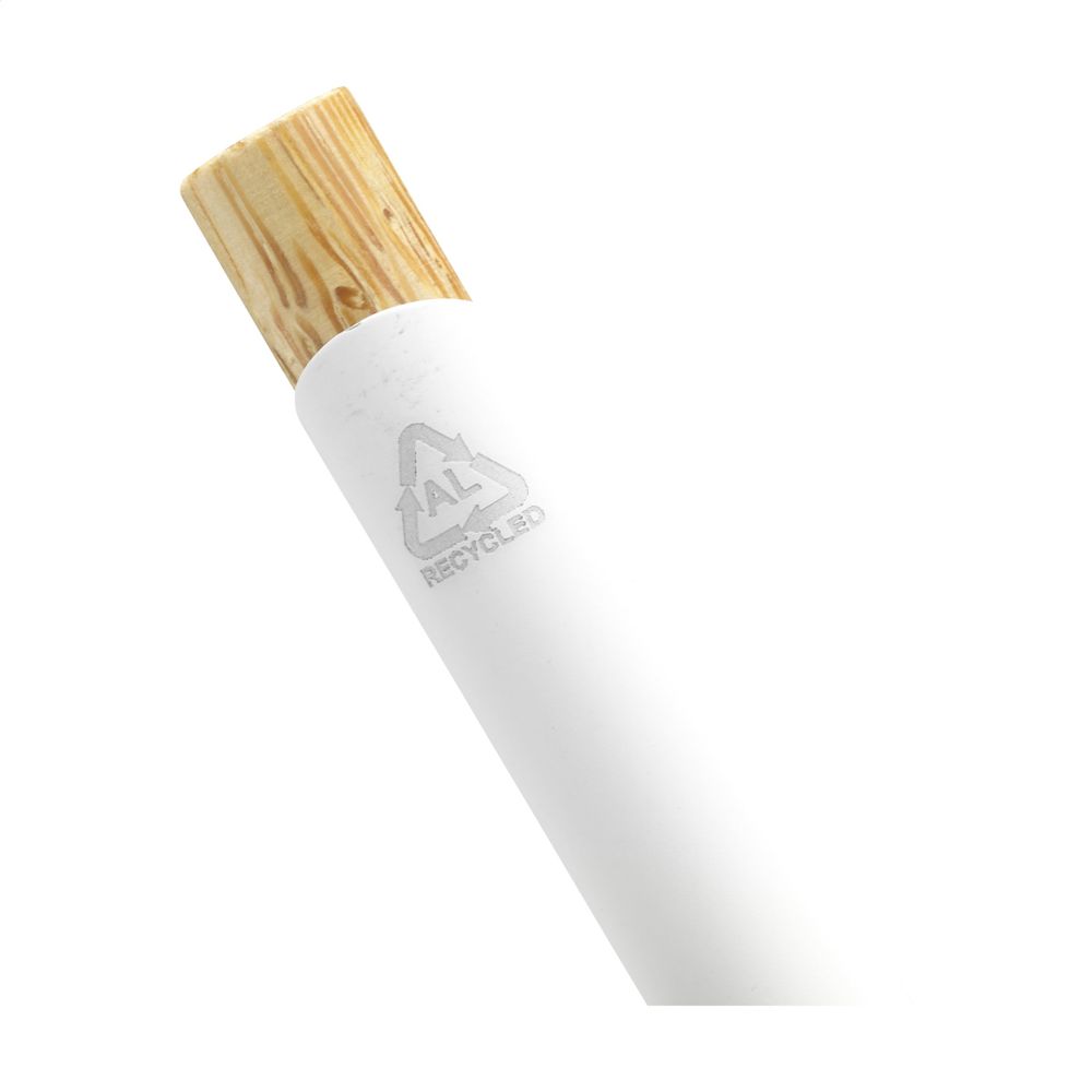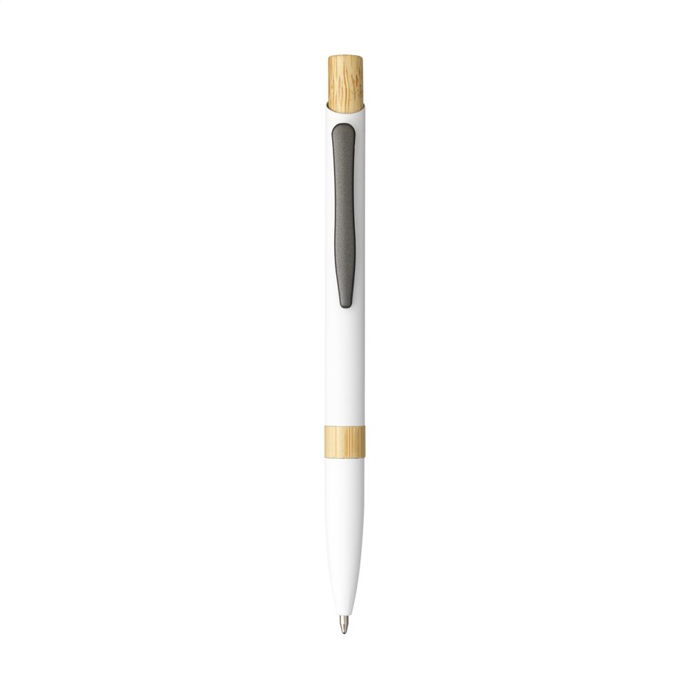 Blauwschrijvende, slanke balpen met houder van 100% gerecycled aluminium met een rubberised finish en stevige, metalen clip. De bamboe accenten geven de pen een natuurlijk karakter. GRS-gecertificeerd. Door het gebruik van gerecycled aluminium worden minder nieuwe grondstoffen gebruikt. Dit betekent minder energieverbruik en minder waterverbruik.