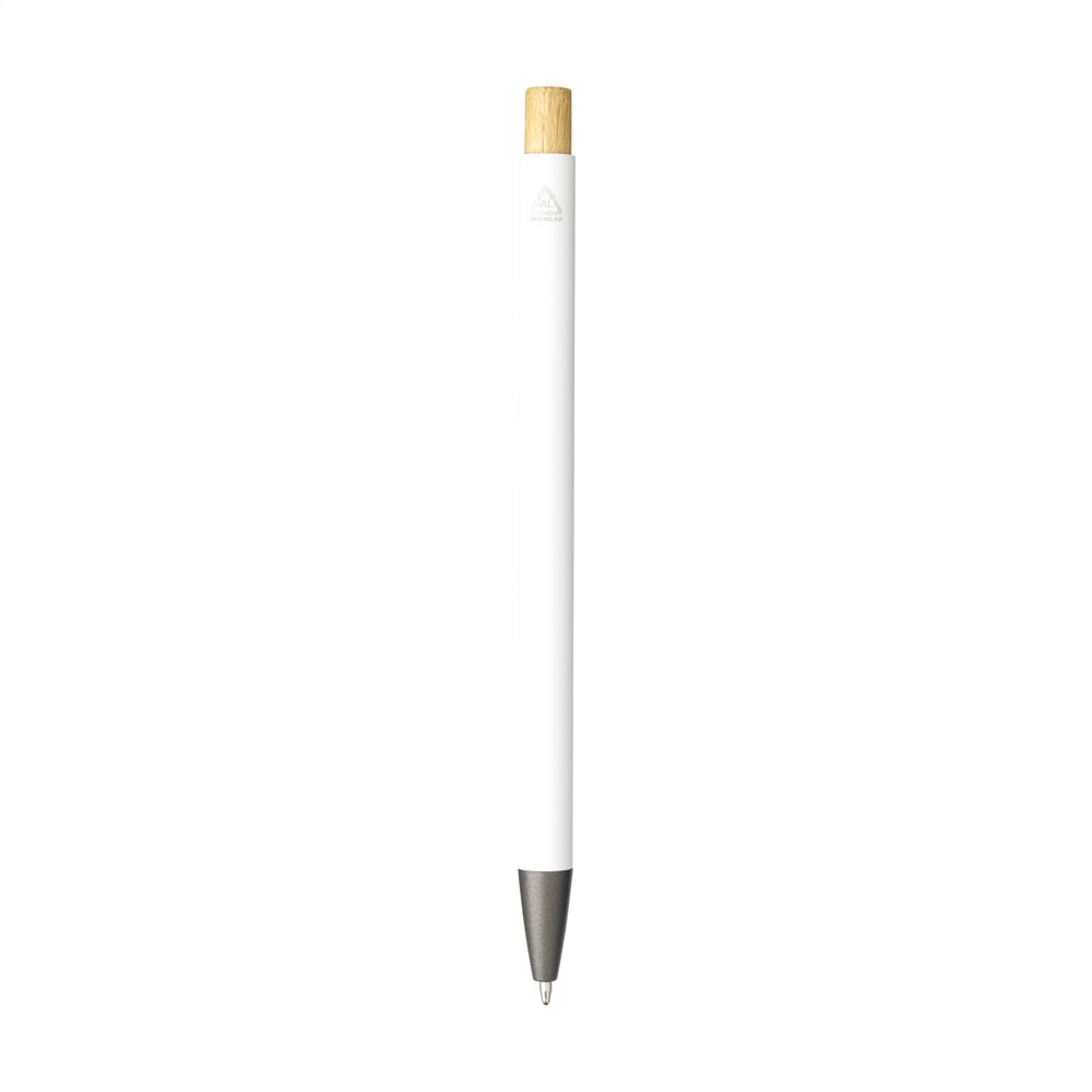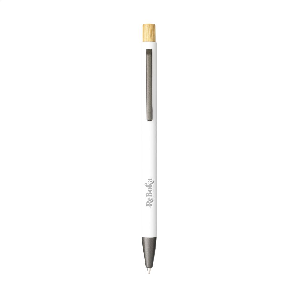 Blauwschrijvende, slanke balpen met houder van 100% gerecycled aluminium met een rubberised finish. Metalen clip. Strak vormgegeven. De bamboe drukknop geeft de pen een natuurlijk tintje. GRS-gecertificeerd. Door het gebruik van gerecycled aluminium worden minder nieuwe grondstoffen gebruikt. Dit betekent minder energieverbruik en minder waterverbruik.