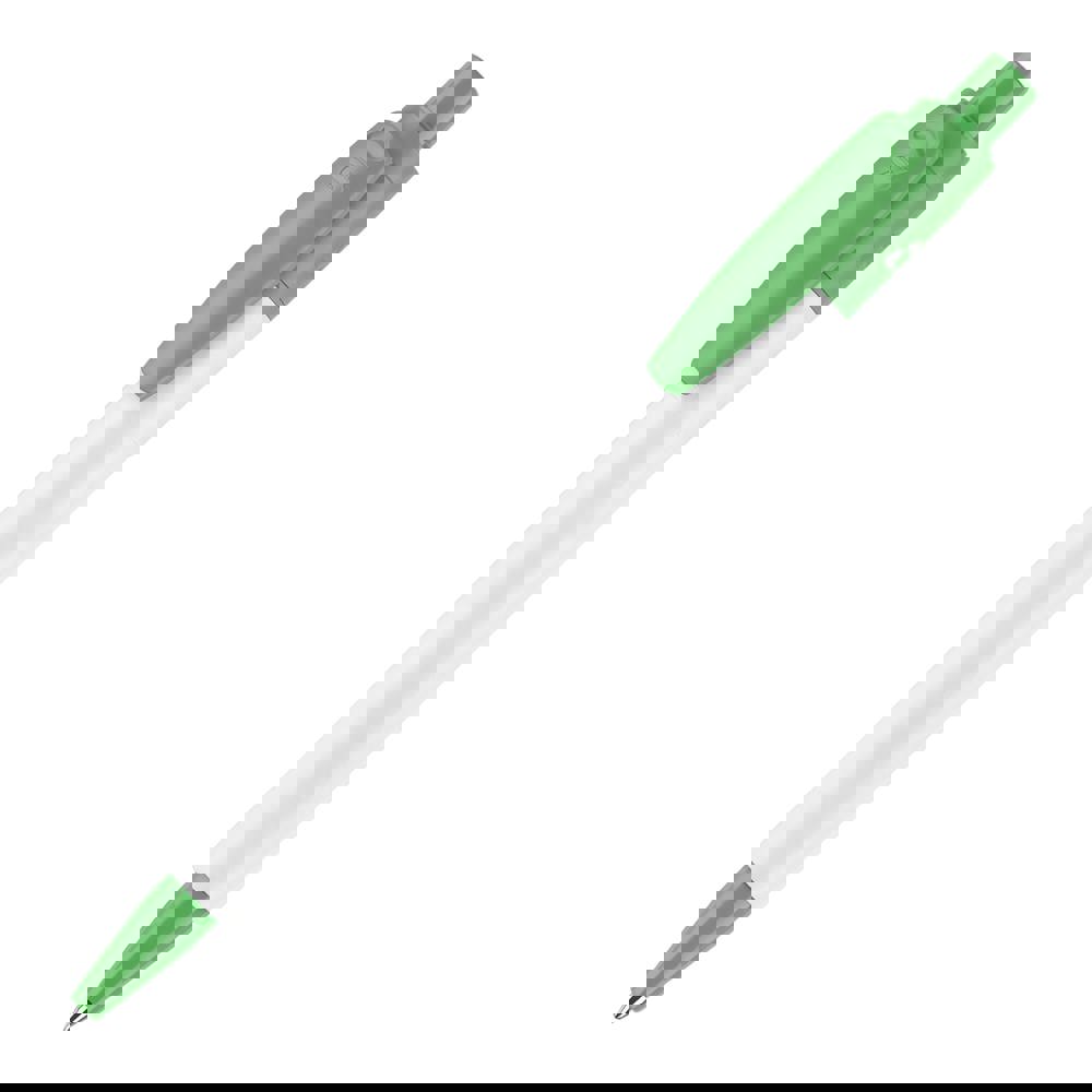 Blauwschrijvende f zwartschrijvende balpen met gekleurd, gripvast voorstuk en metalen clip.