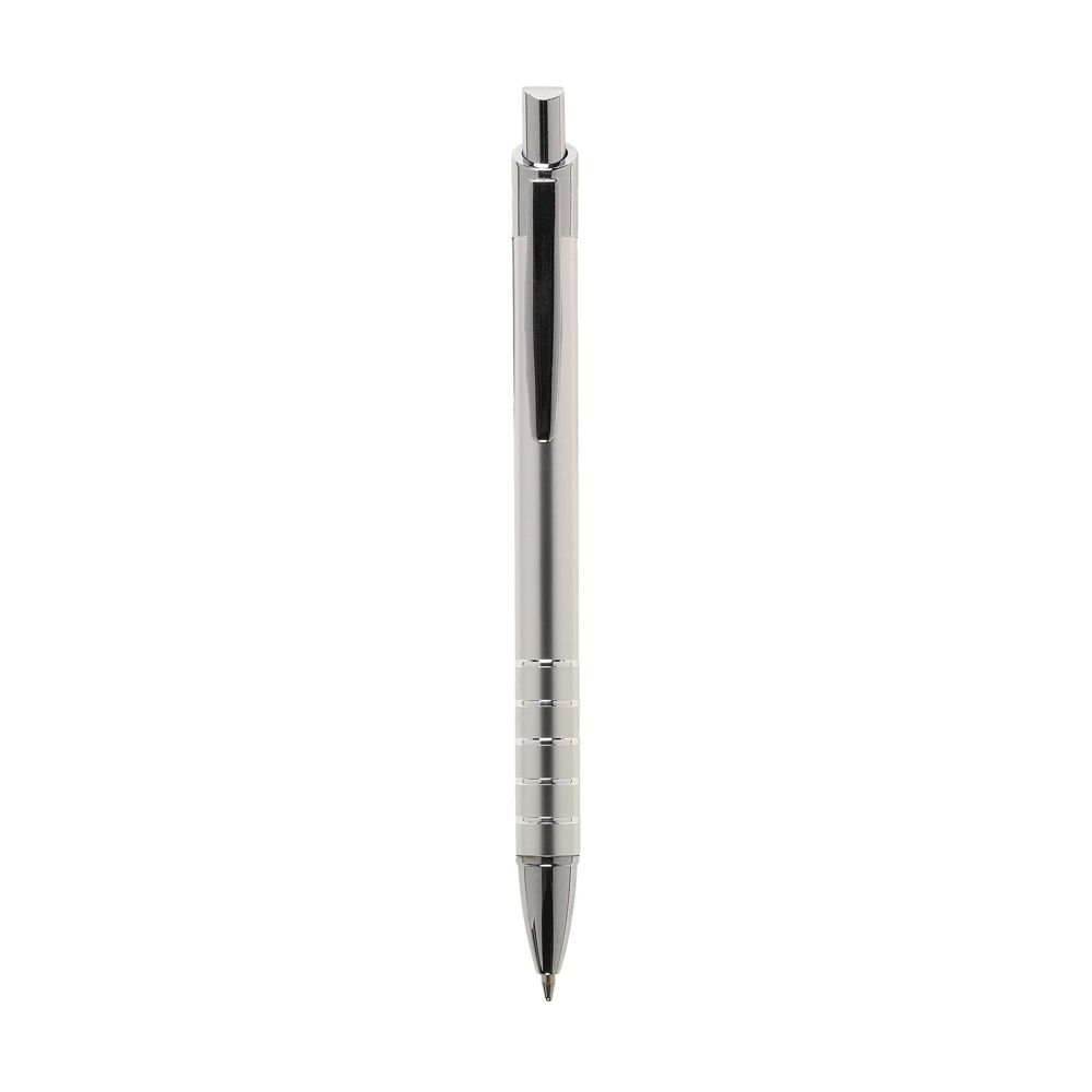 Blauwschrijvende, aluminium balpen in metallic look, met metalen clip en tussenringen.