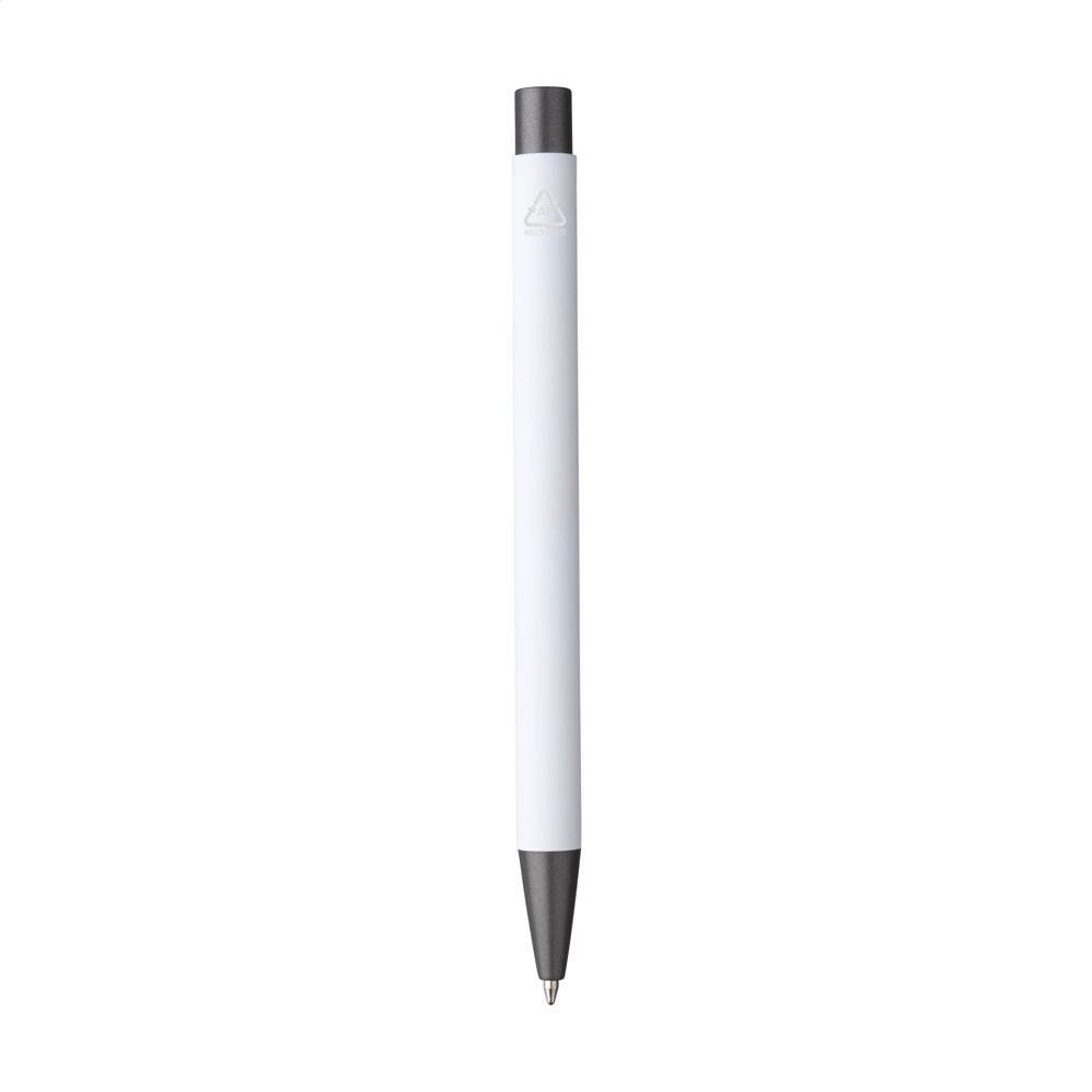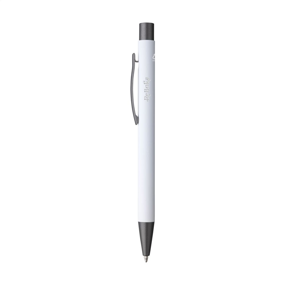 Blauwschrijvende balpen gemaakt van gerecycled aluminium. De houder is afgewerkt met een mooie rubberised finish. Met stevige metalen clip en kunststof puntstuk en drukknop. Door het gebruik van gerecycled aluminium worden er minder nieuwe grondstoffen gebruikt tijdens de productie van dit product. Dit betekent minder energieverbruik en minder gebruik van water.