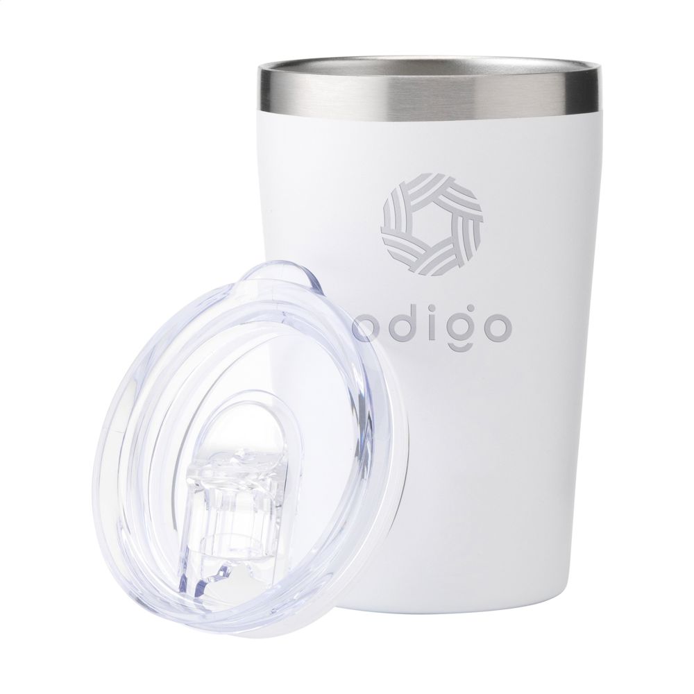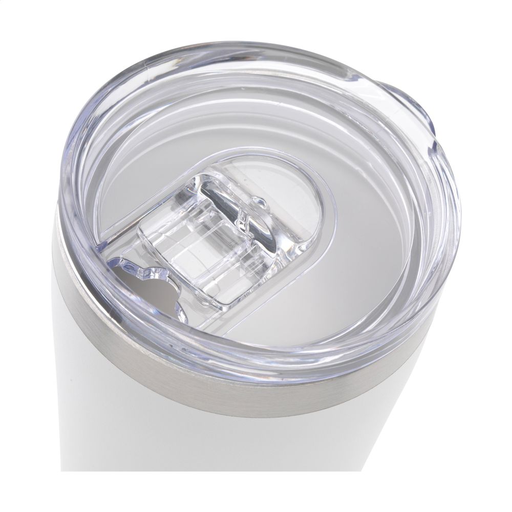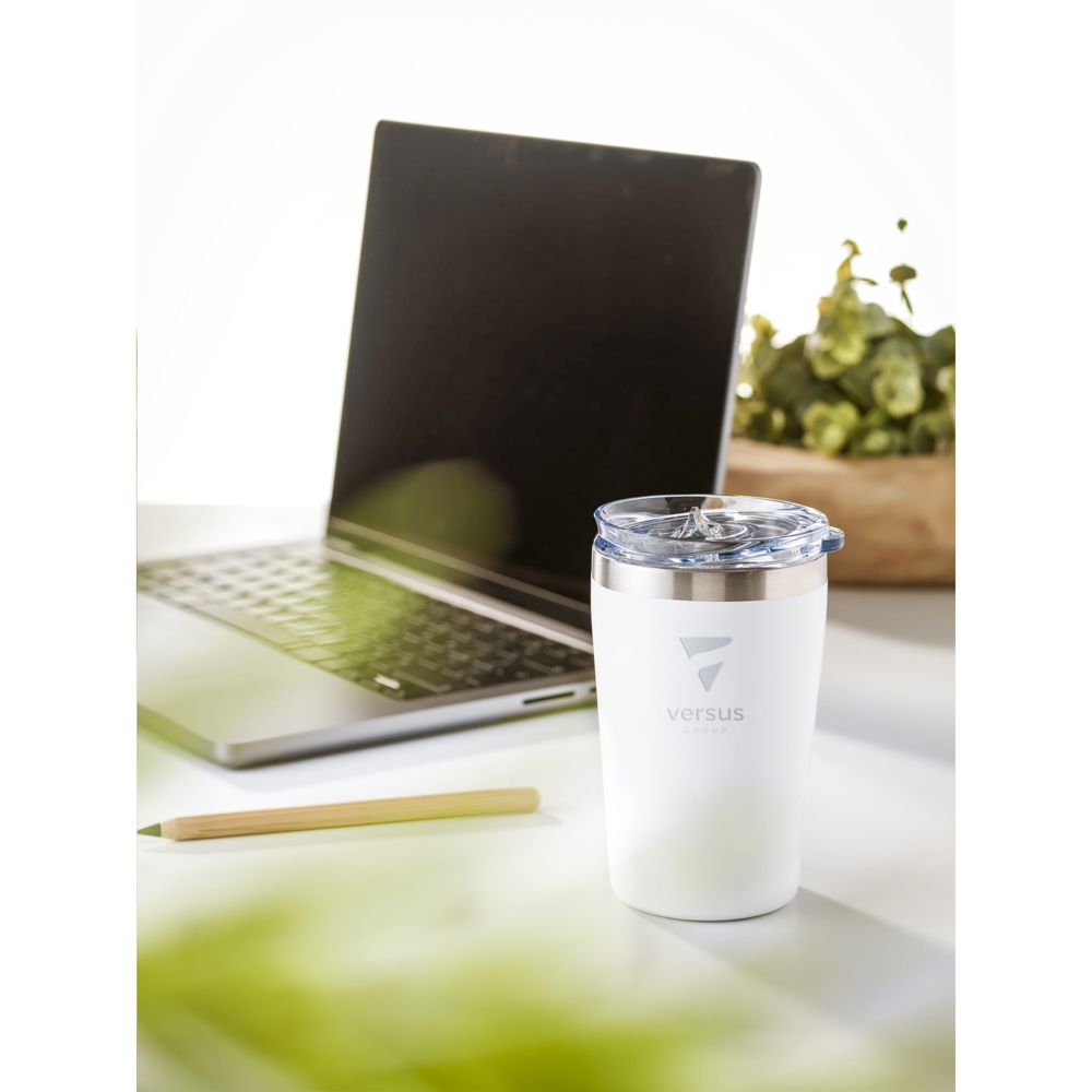 Dubbelwandige thermosbeker van gerecycled RVS. Afgewerkt met een mooie poeder coating. De beker heeft een transparante push-on deksel voorzien van een afsluitbare drinkopening. Past perfect in de koffiehouder van je auto. Ideaal voor onderweg. Niet vaatwasserbestendig. RCS-gecertificeerd. Totaal gerecycled materiaal: 75%. Inhoud 380 ml. RVS kan vele malen gerecycled worden terwijl de kwaliteit van het materiaal grotendeels behouden blijft. Door het gebruik van gerecycled RVS worden minder nieuwe grondstoffen gebruikt. Dit betekent minder energieverbruik en minder gebruik van water. Per stuk verpakt.