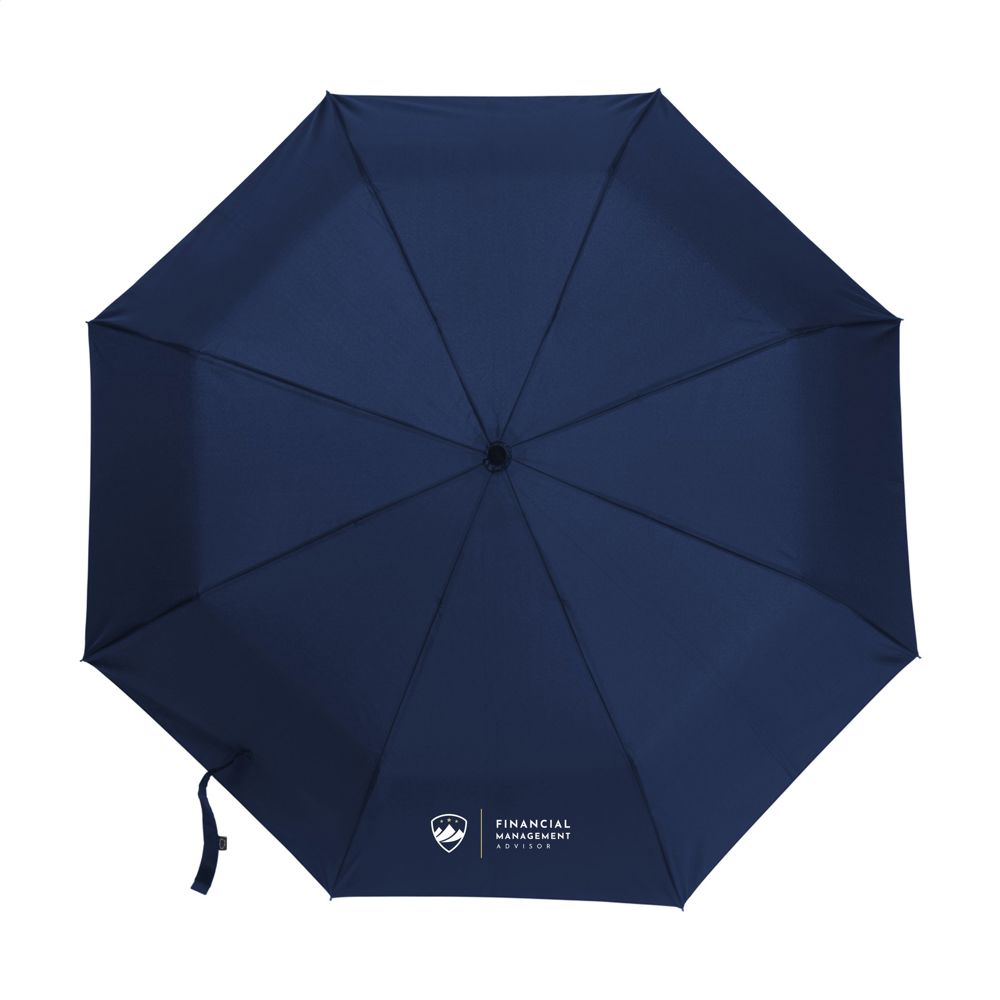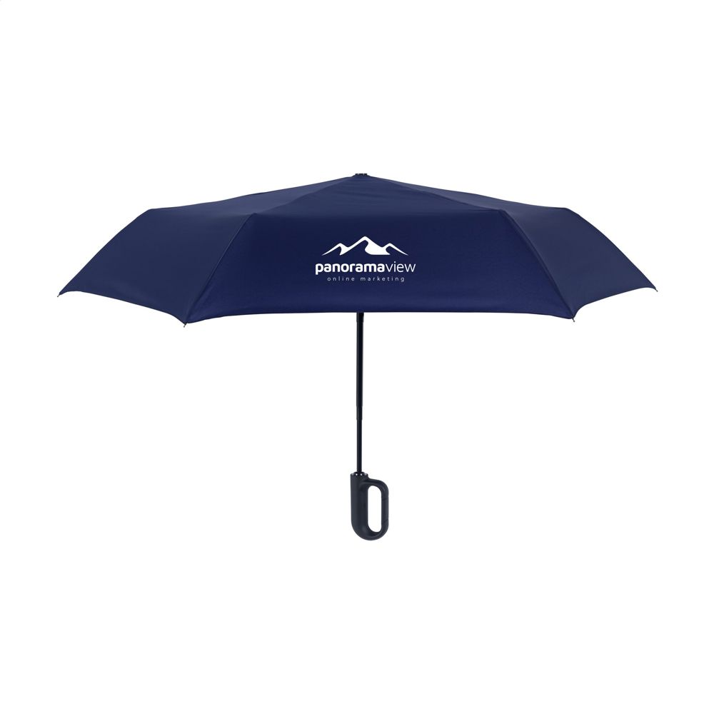 Volautomatische in- en uitklapbare paraplu met 190T RPET pongee polyester bespanning en een comfortabele kunststof handgreep in de vorm van een karabijnhaak. Hiermee kan de paraplu eenvoudig worden opgehangen aan bijvoorbeeld een (rug)tas. Met een schermdoorsnede van 97 cm, metalen steel, glasvezel frame, klittenbandsluiting en opberghoes. Afm. dichtgevouwen: 7 x 6 x 33 cm. RCS-gecertificiceerd. Totaal gereycled materiaal: 15%.