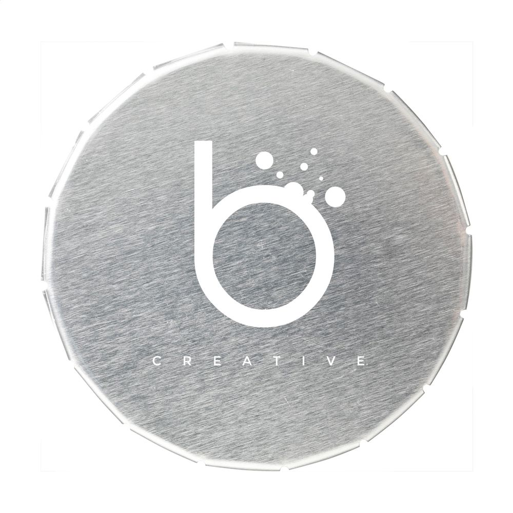 Uitdeelblikje met handig druk-/kliksysteem. Gevuld met ca. 12 g snoepjes.