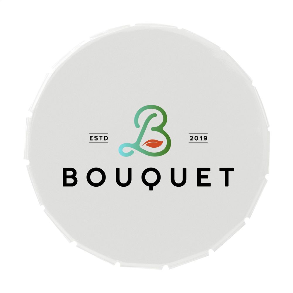 Uitdeelblikje met handig druk-/kliksysteem. Gevuld met ca. 12 g snoepjes.