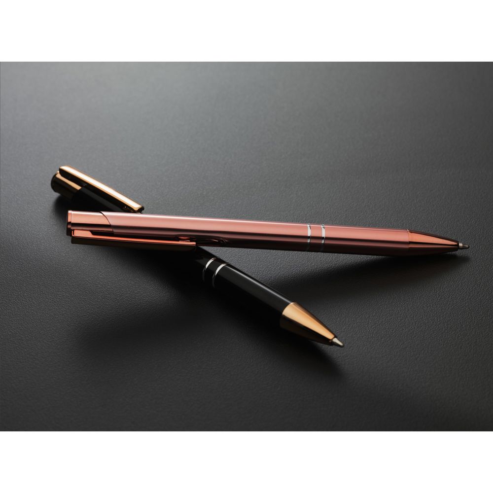 Blauwschrijvende balpen van gerecycled aluminium met een stevige, roségouden clip/drukknop van gerecycled aluminium. De pen heeft elegante roségouden en zilverkleurige accenten en is daarmee een opvallend chique verschijning. RCS-gecertificeerd. Totaal gerecycled materiaal: 94%. Door het gebruik van gerecycled aluminium worden er minder nieuwe grondstoffen gebruikt tijdens de productie van dit product. Dit betekent minder energieverbruik en minder gebruik van water.