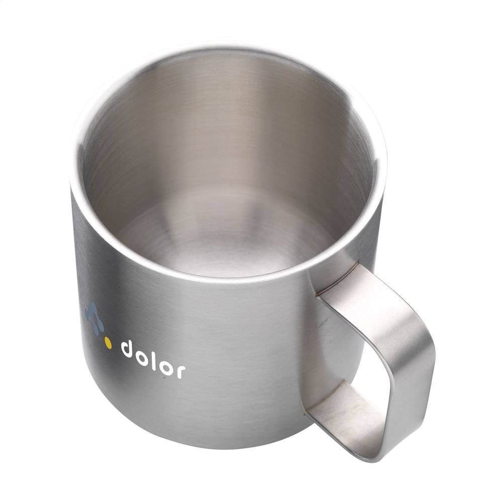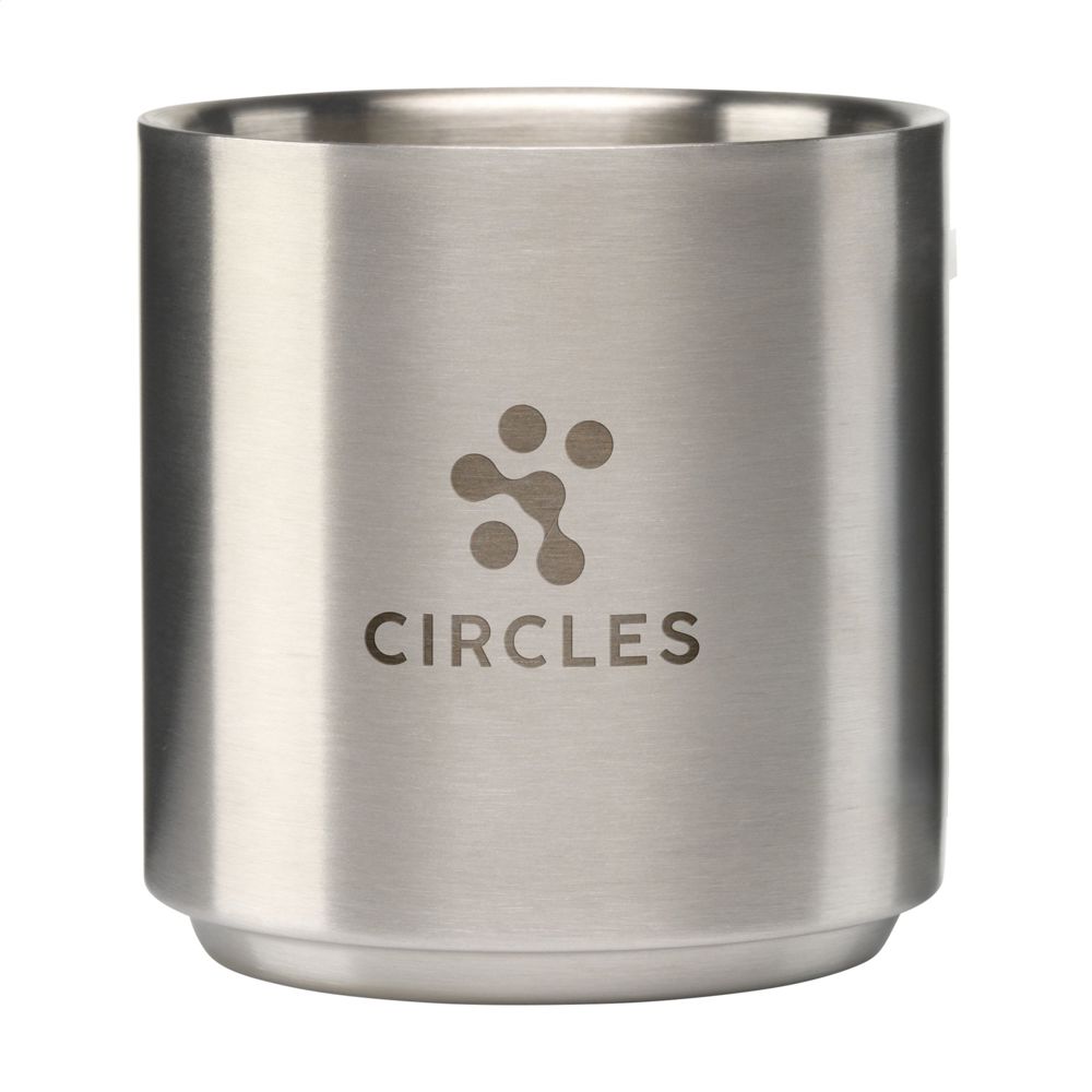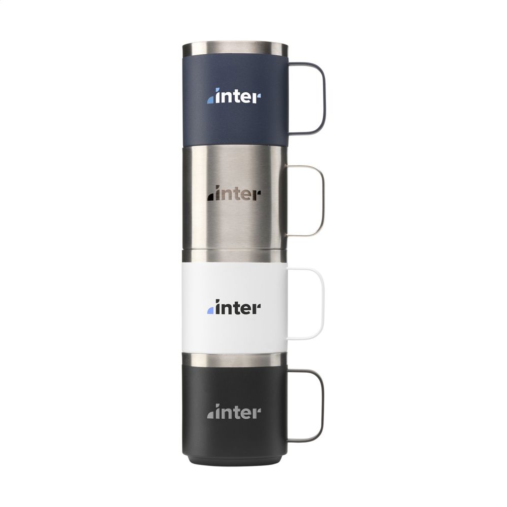 Dubbelwandige, stapelbare mok. De binnen- en buitenwand zijn gemaakt van gerecycled RVS. Hierdoor blijft warme drank langere tijd op temperatuur. Afgewerkt met een mooie poedercoating. RCS-gecertificeerd. Totaal gerecycled materiaal: 87%. Inhoud 300 ml. RVS kan vele malen gerecycled worden terwijl de kwaliteit van het materiaal grotendeels behouden blijft. Door het gebruik van gerecycled RVS worden minder nieuwe grondstoffen gebruikt. Dit betekent minder energieverbruik en minder gebruik van water. Per stuk verpakt.