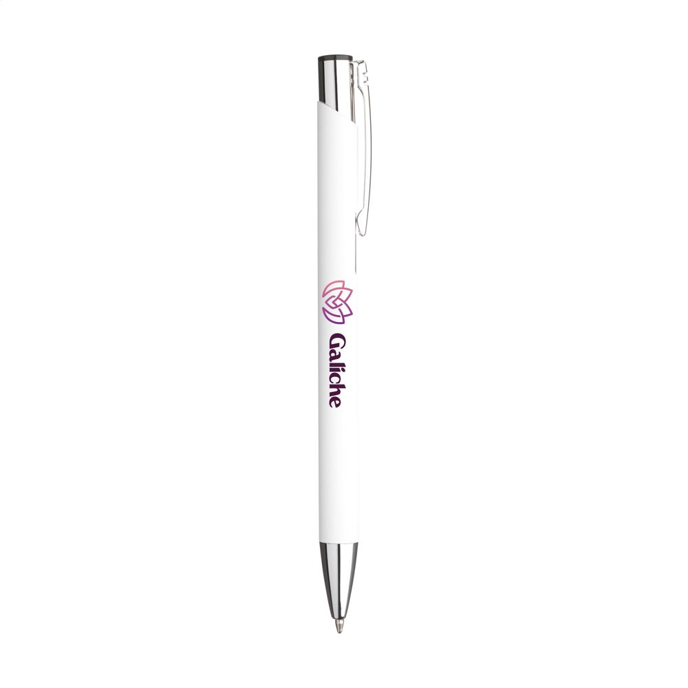 Blauwschrijvende, aluminium balpen met metalen clip. De houder is afgewerkt met een mooie rubberised finish. Doordat de houder uit één geheel bestaat heeft deze pen ruimte voor een grote opdruk.