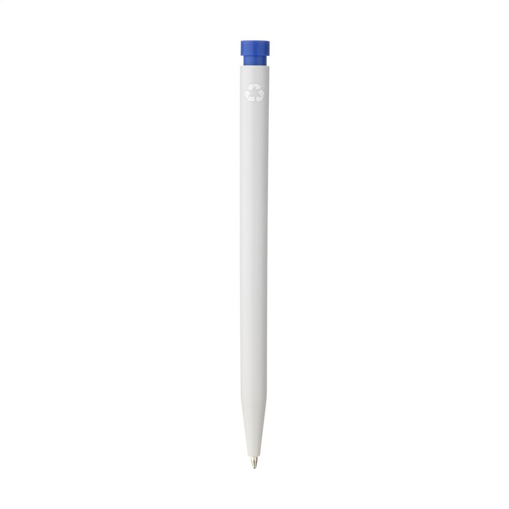WoW! Blauwschrijvende balpen gemaakt van 85% post-consumer recycled ABS afkomstig van huishoudelijke apparaten. Het oude kunststof wordt gesorteerd en verwerkt tot produceerbaar schroot als nieuwe grondstof. De pen is standaard bedrukt met het recyclingssymbool.