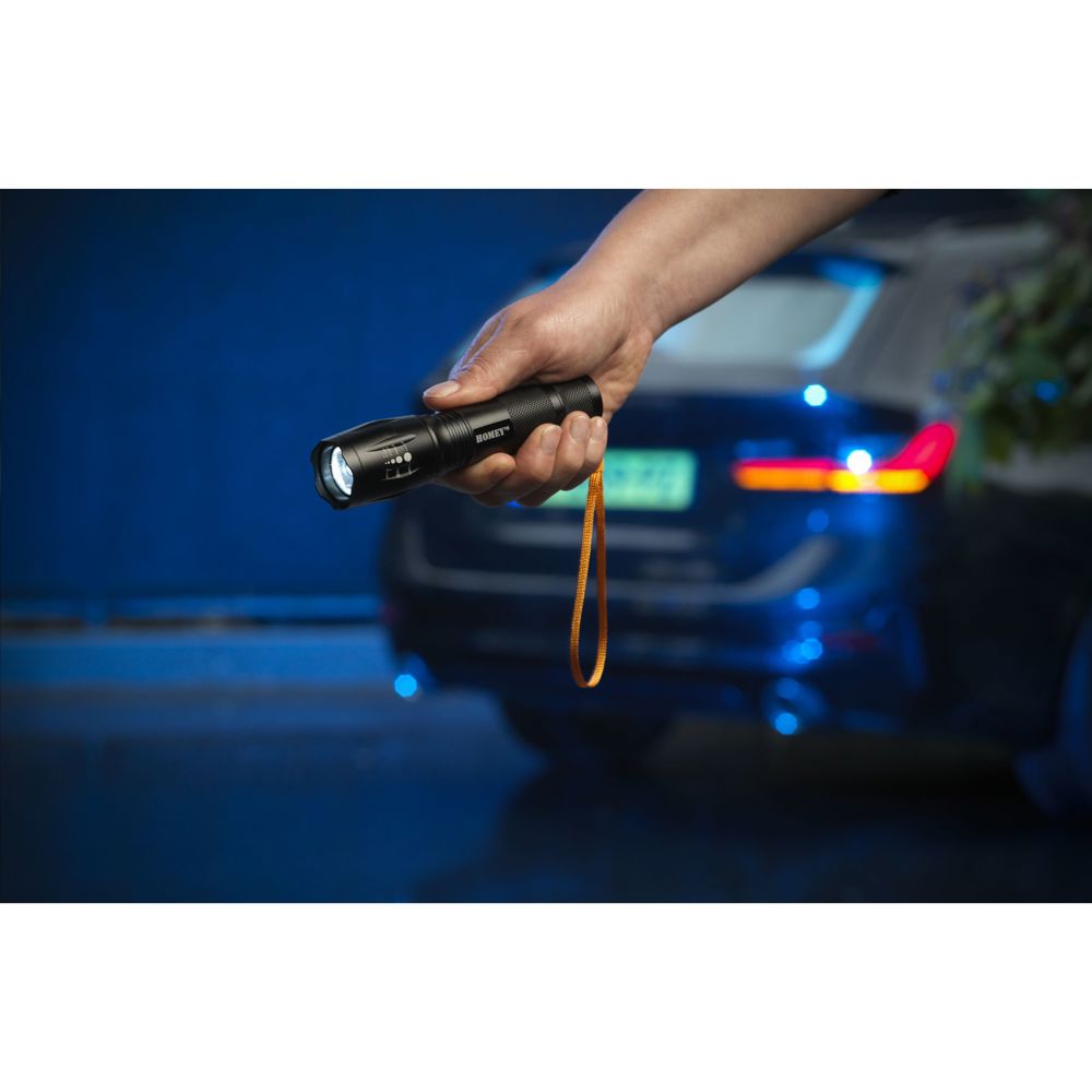 Compacte, lichtgewicht aluminium zaklamp van het merk Homey's. Met T6 LED (200 lumen). Deze veelzijdige lamp heeft een flitslicht, SOS functie en zoomfunctie in drie standen. Zoom in voor een geconcentreerde lichtbundel op specifieke gebieden, of zoom uit voor een breder verlichtingsbereik. Maximale gebruiksduur 3,5 uur. Bereik 150 meter. Waterbestendig (IP55). Geschikt voor de handige klusser, outdoor activiteiten en noodgevallen. Inclusief polslus en batterijen. Per stuk verpakt.