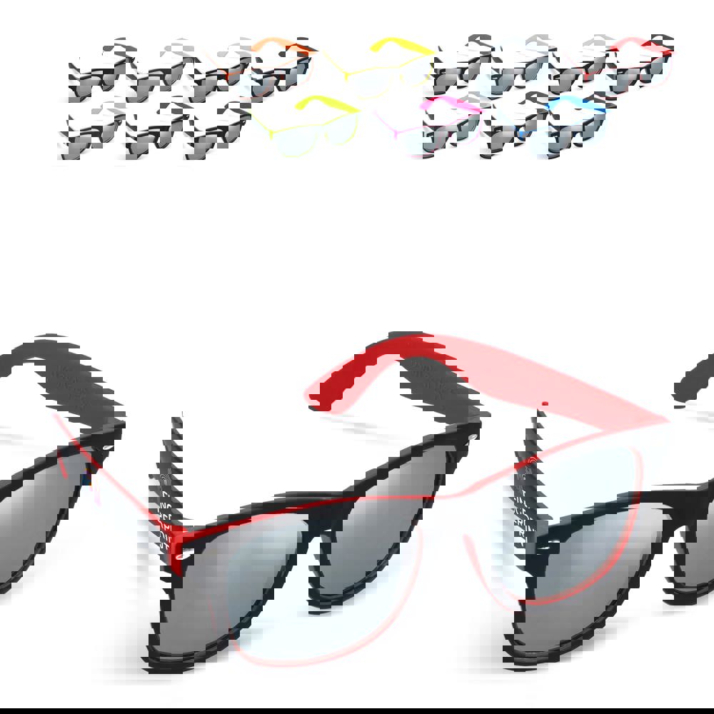 Opvallende zonnebril met spiegelglazen. In het montuur komen twee kleuren samen. De kleur van het glas matcht perfect met de kleur in het montuur. Met UV 400 bescherming (volgens Europese normen).