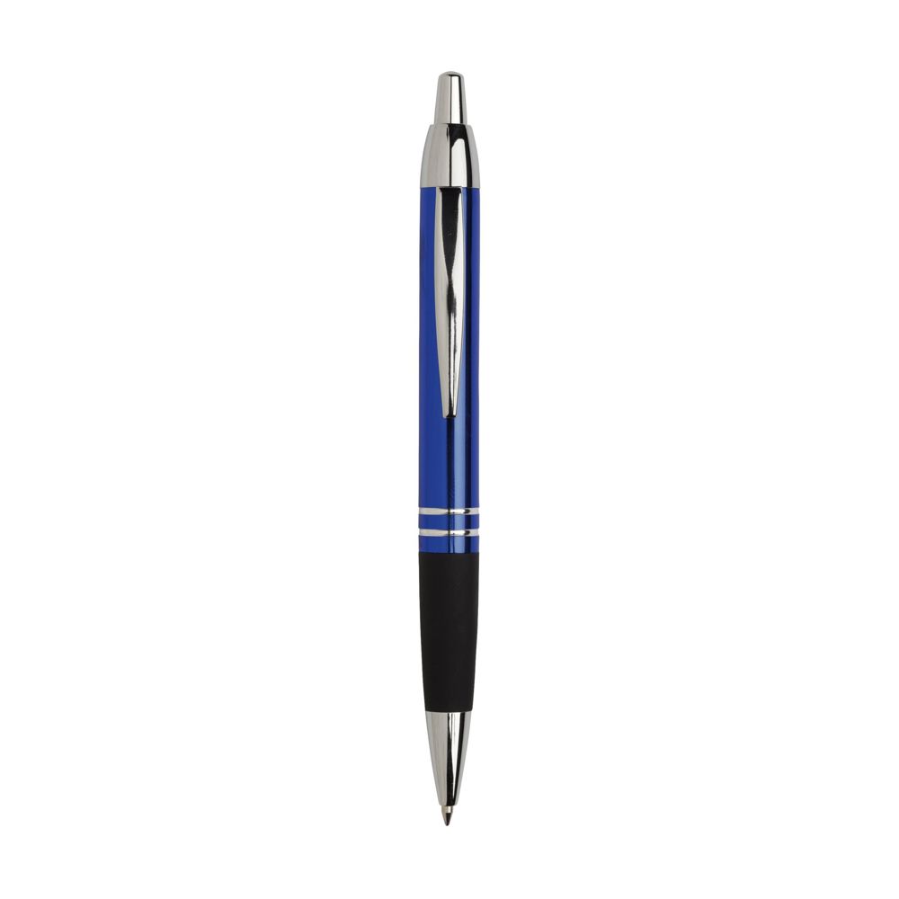 Blauwschrijvende, metalen balpen met hoogglans metallic look houder, gripvast, rubberen voorstuk, stevige, metalen clip en drukknop en zilverkleurige hoogglans accenten.