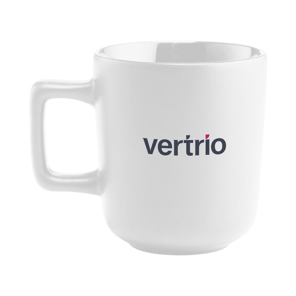 Mok van hoogwaardig keramiek met een opvallend oor. Afgewerkt met een matte buitenzijde en hoogglans binnenzijde. Vaatwasserbestendig. De opdruk is vaatwasmachine getest en gecertificeerd: EN 12875-2. Inhoud 280 ml. OPMERKING: De witte mok kan niet worden voorzien van een lasergravure omdat deze onvoldoende zichtbaar is.
