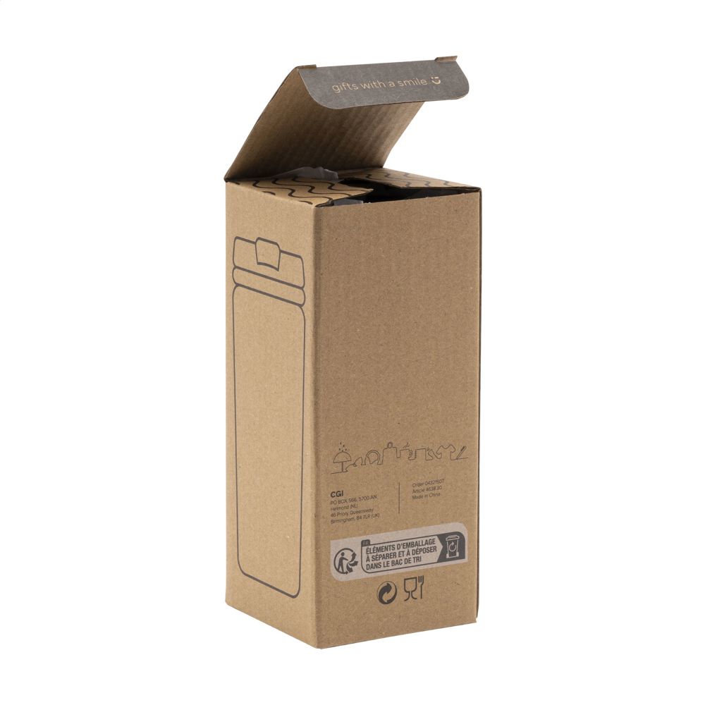 Retap Bottles worden standaard in een kartonnen doos verpakt met verschillende flessen samen. Maar ook verpakking per stuk of per twee is ook mogelijk. Vanaf duizend stuks kunnen de dozen volledig bedrukt worden. Voor geschenken kun je de fles in een koker laten verpakken. Bij aankoop van duizend stuks is de koker volledig bedrukbaar.